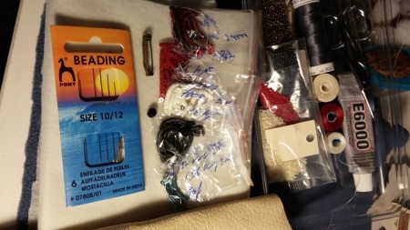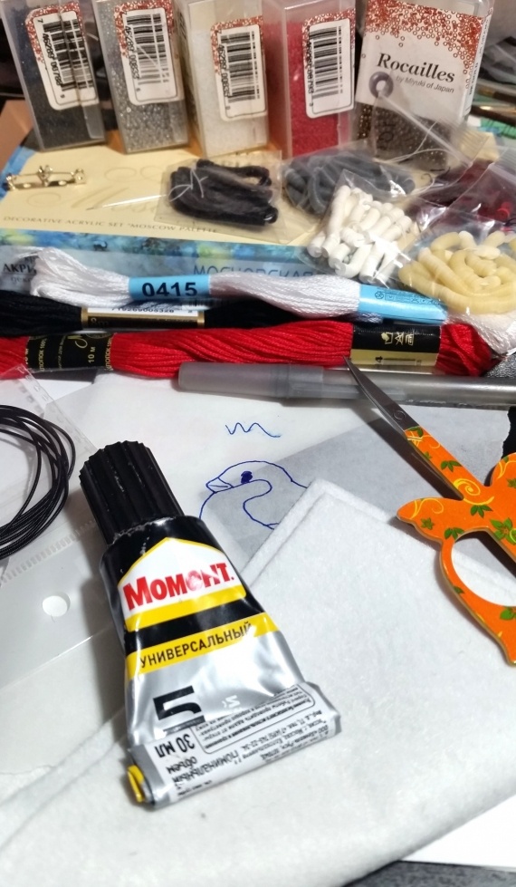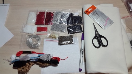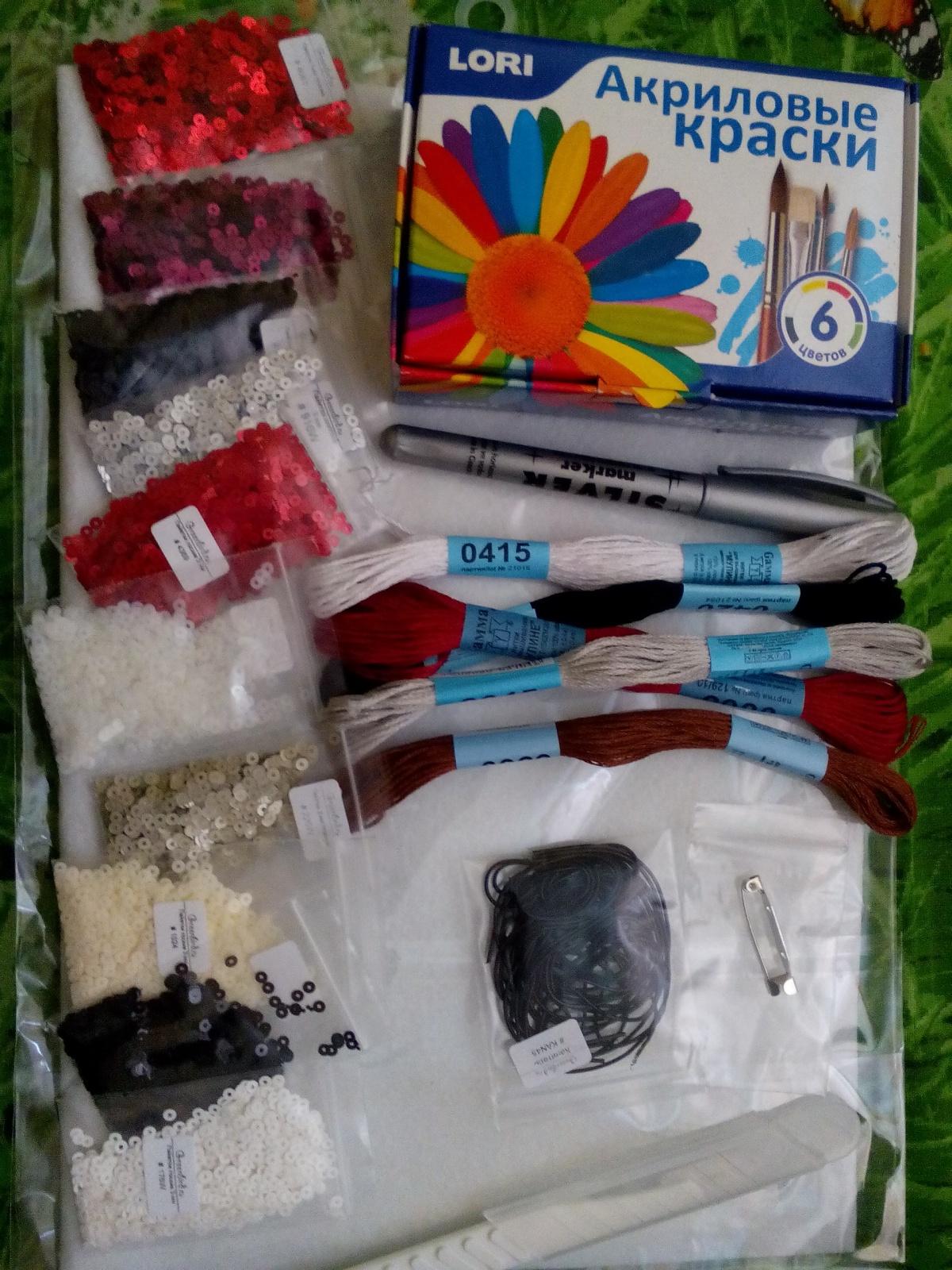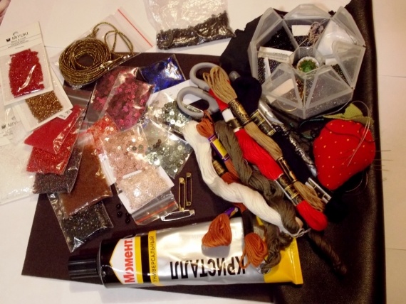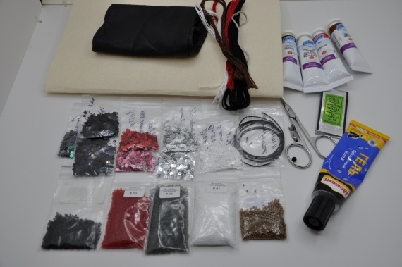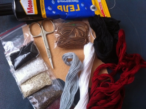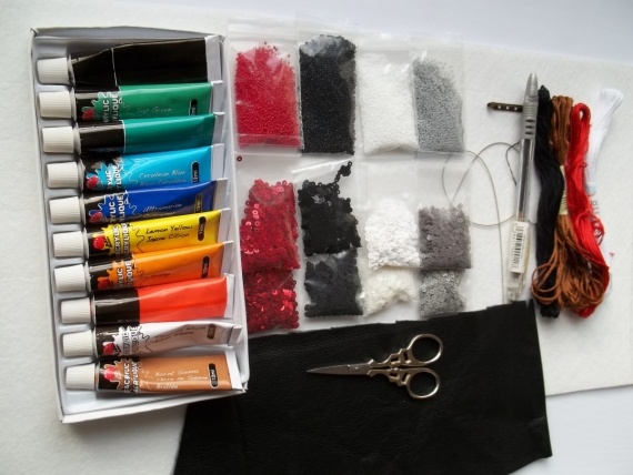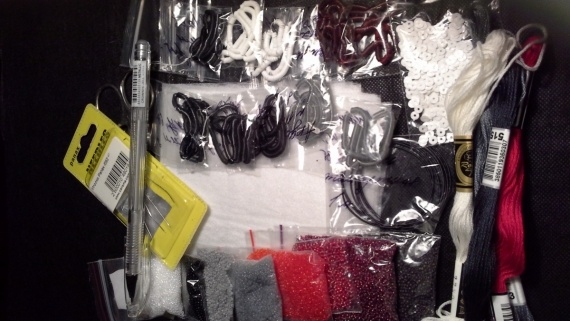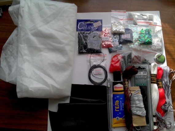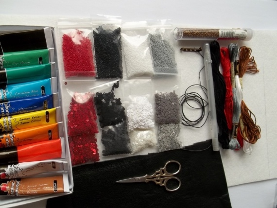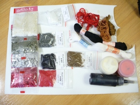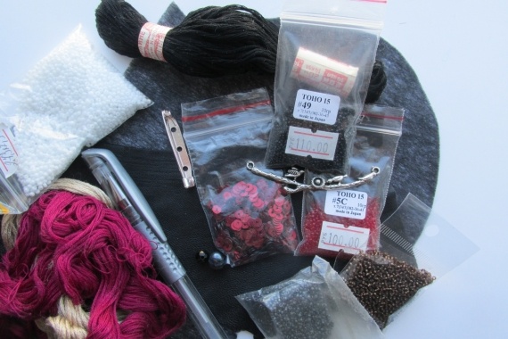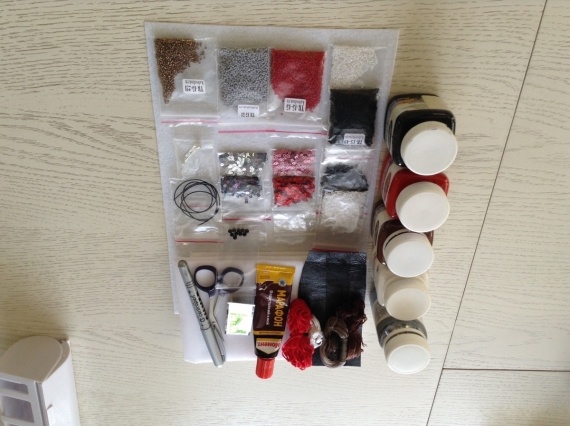 Получила недостающее, остальное (бисер, кожа, флизелин) в большом количестве. В кадр не влезло))