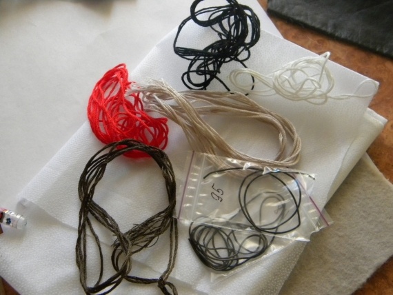 10. Нитки для вышивки мулине хлопок. Цвета — черный, серый, белый, красный, цвета дерева для веточки.