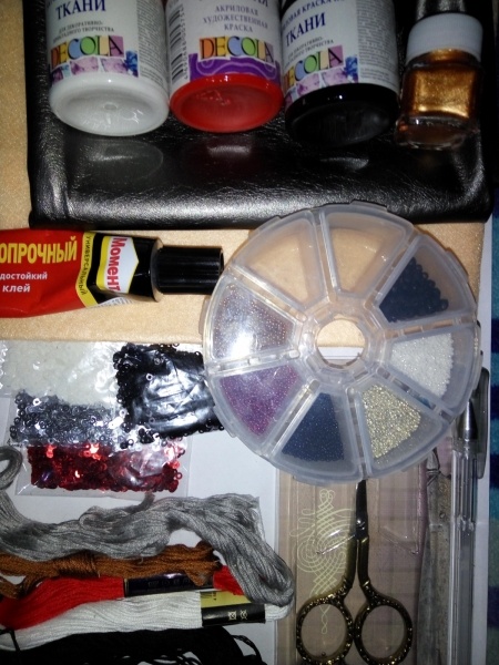 канитель есть серебро и золото. Черные пайетки и канитель заказала, надеюсь успеют доехать. Булавка, иголки, серебряная ручка, кожа для задника тоже есть