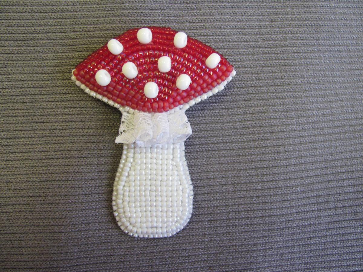 Для мухомора надо — Моделируемый фетр красного или розового цвета для шляпки 9х10 см, если цвет гриба будет другой, то фетр подбираем под цвет бисера на шляпке, белый фетр или флизелин, склеенный в 8 слоев 8х5 см для ножки, кожа для изнанки 10х8 см, кружево 10 см (ширина любая), тонкий синтепон 5х10 см, пластик или плотный картон для внутренней основы 7х8 см, застежка для брошки (не большая), Красный бисер Тохо № 11, Белый бисер Тохо № 11 и № 15, для бородавок мухомора можно использовать шатоны, мелкие бусины, жемчуг или крупный бисер.