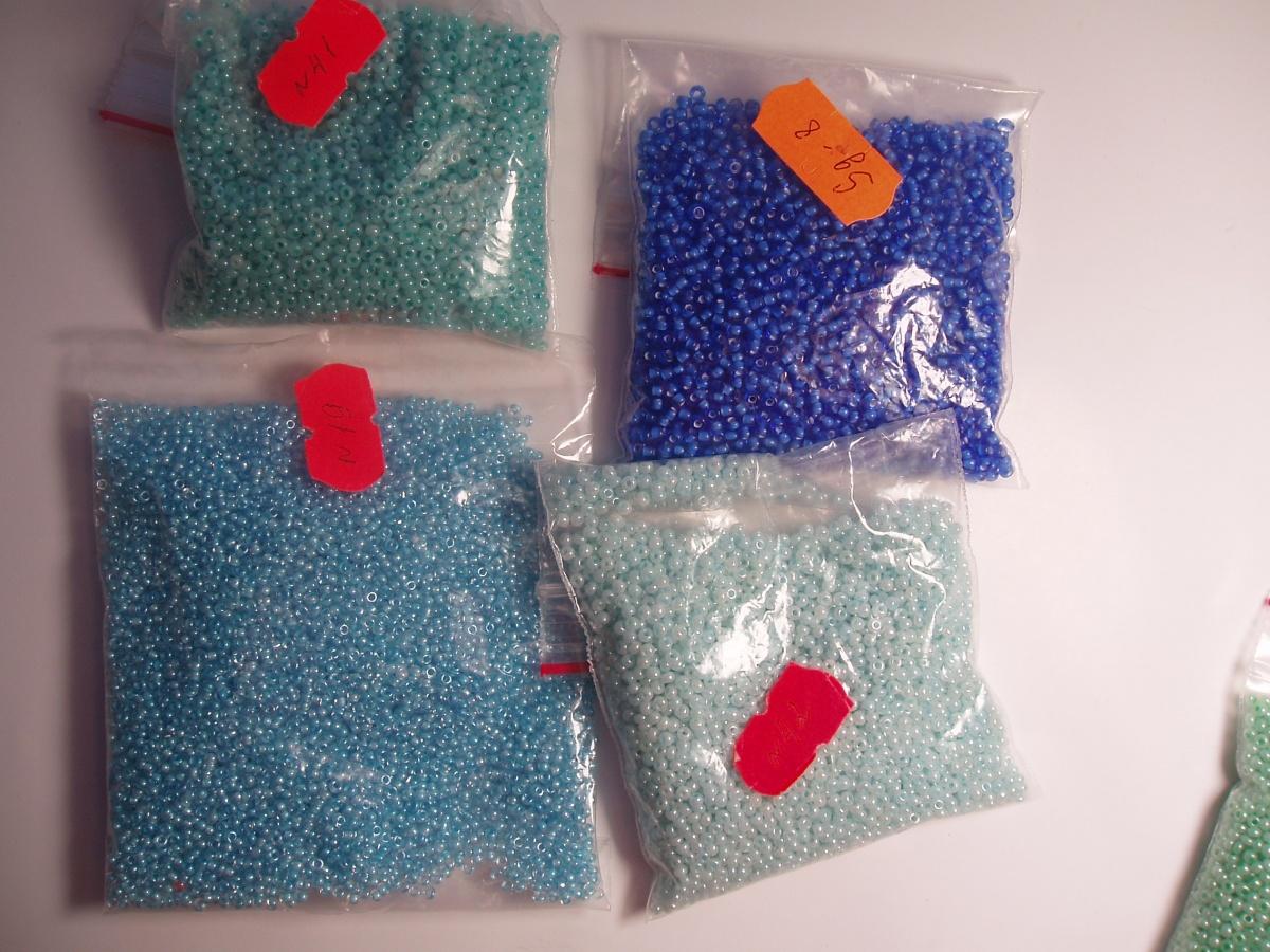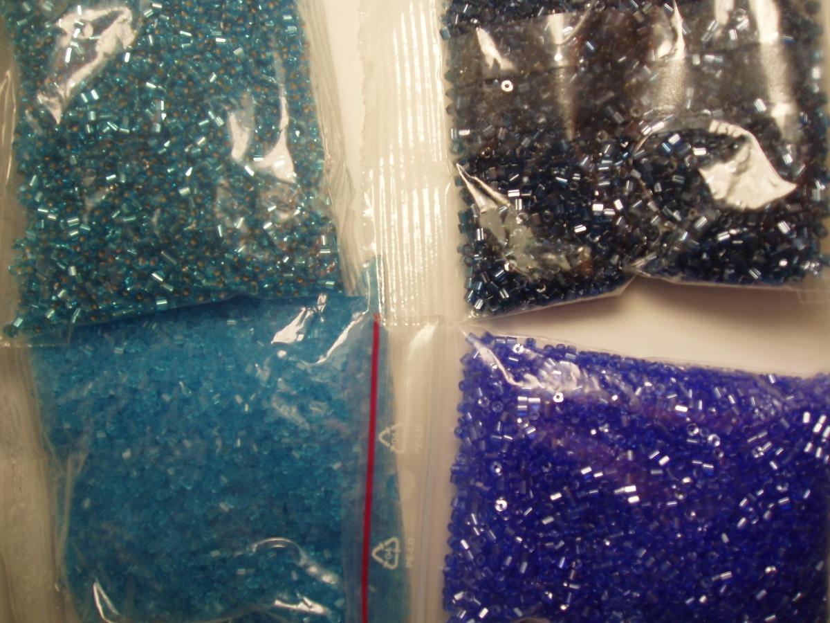 Бисер голубого, василькового, немного желтого и зеленого цветов, а также рубка и стеклярус этих цветов+большие размеры 8/0-7/0-6/0
