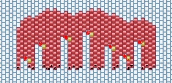 снизу )))там где меньше бисеринок и идти наверх постепенно расширяя полотно. Чёрным отметила бисеринки первого ряда, то, что набирается на нитку. Плетётся мозаикой до момента расширения ( жёлтая клетка ), там вместо одной бисеринки вы вплетаете сразу две. В следующем ряду между этими двумя вплетается бисеринка как в обычной мозаикой и так далее. В результате полотно расширяется к верху.