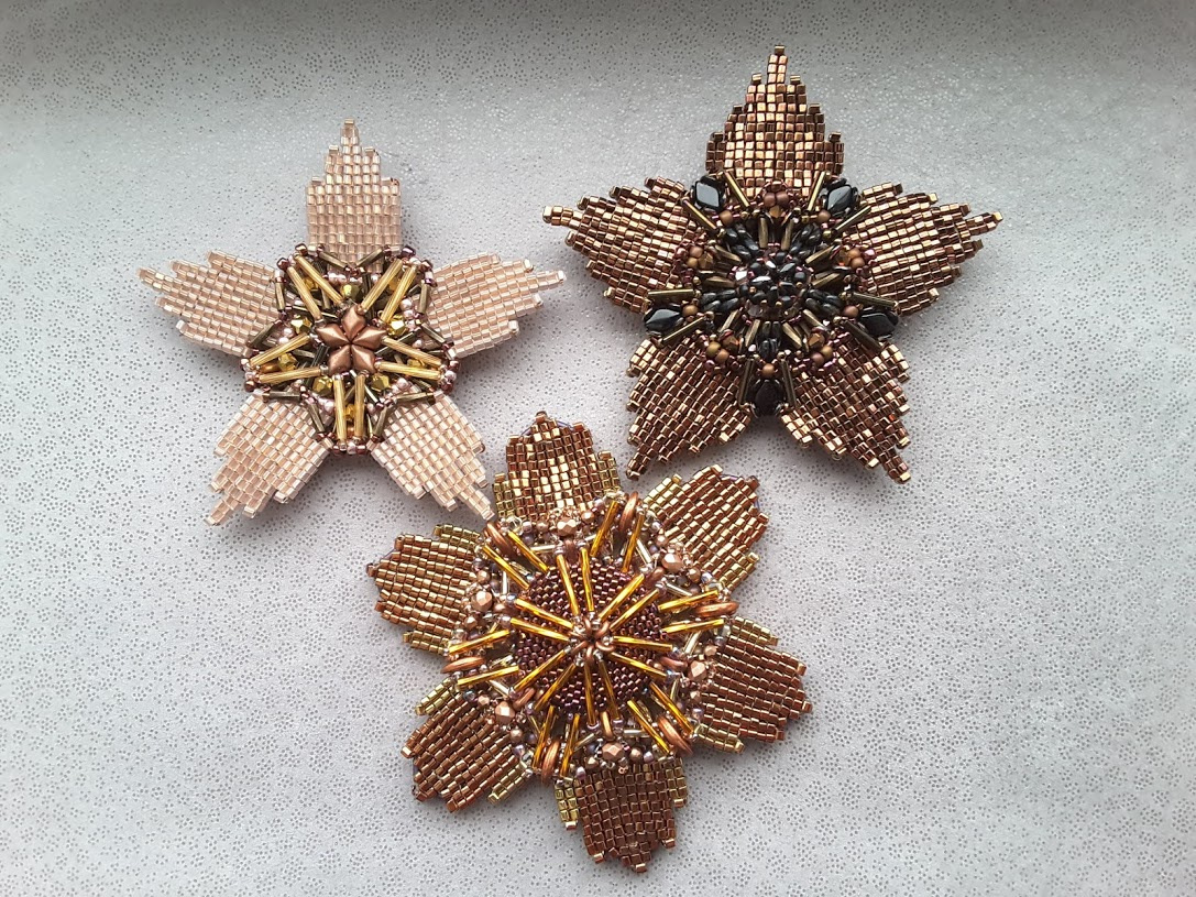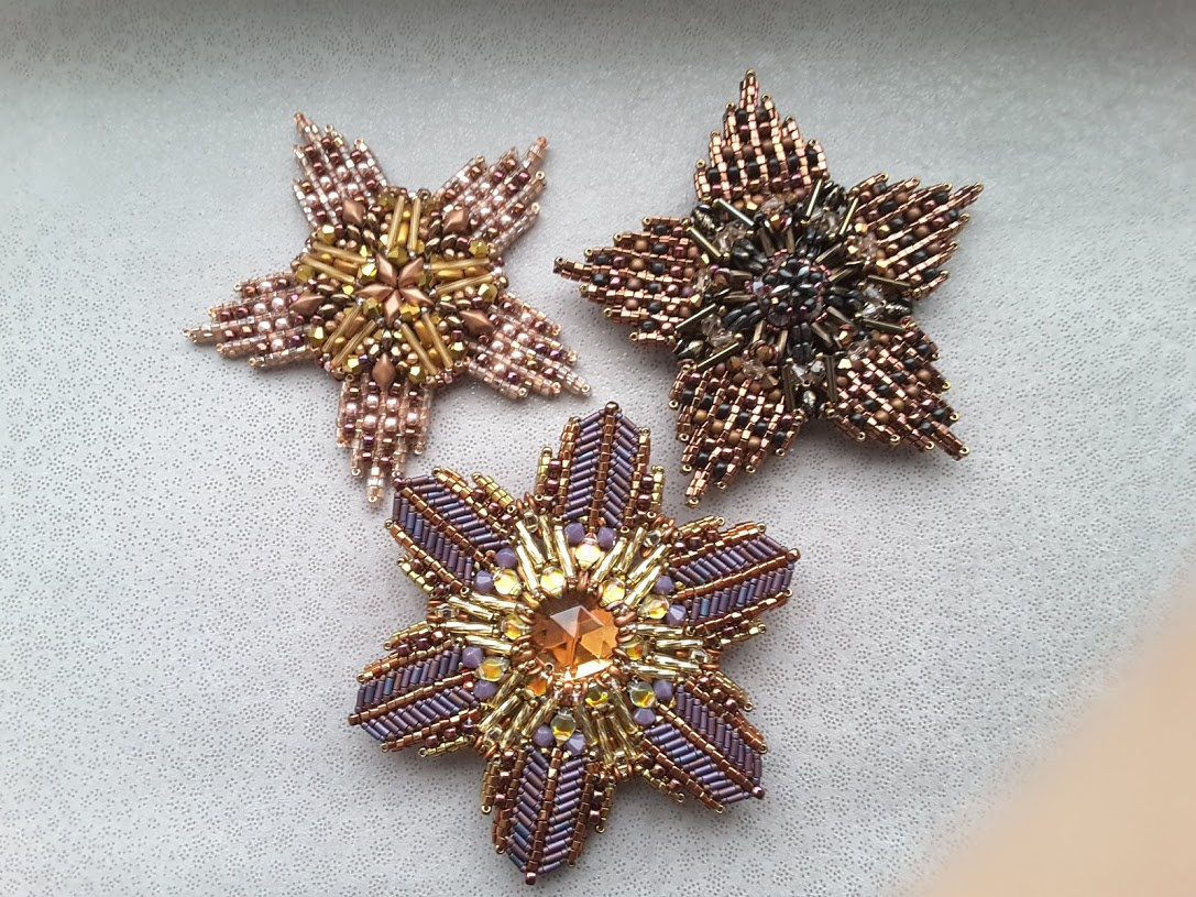 1ую звезду лепила вообще ни про кого не думая. Приступив ко второй, решила фоткать для заинтересованных (в Москве ну о-о-очень темно), но, сплетя центральную втулку, после этого было 3-4 кардинальных переделки, следовательно, когда всё пошло как надо энтузиазм уже пропал, а у 3ьей звезды в центре нестандартный кристалл с 6ью гранями, поэтому нет смысла даже мне запоминать его оплетение, я и не помню, откуда этот кристалл взялся.