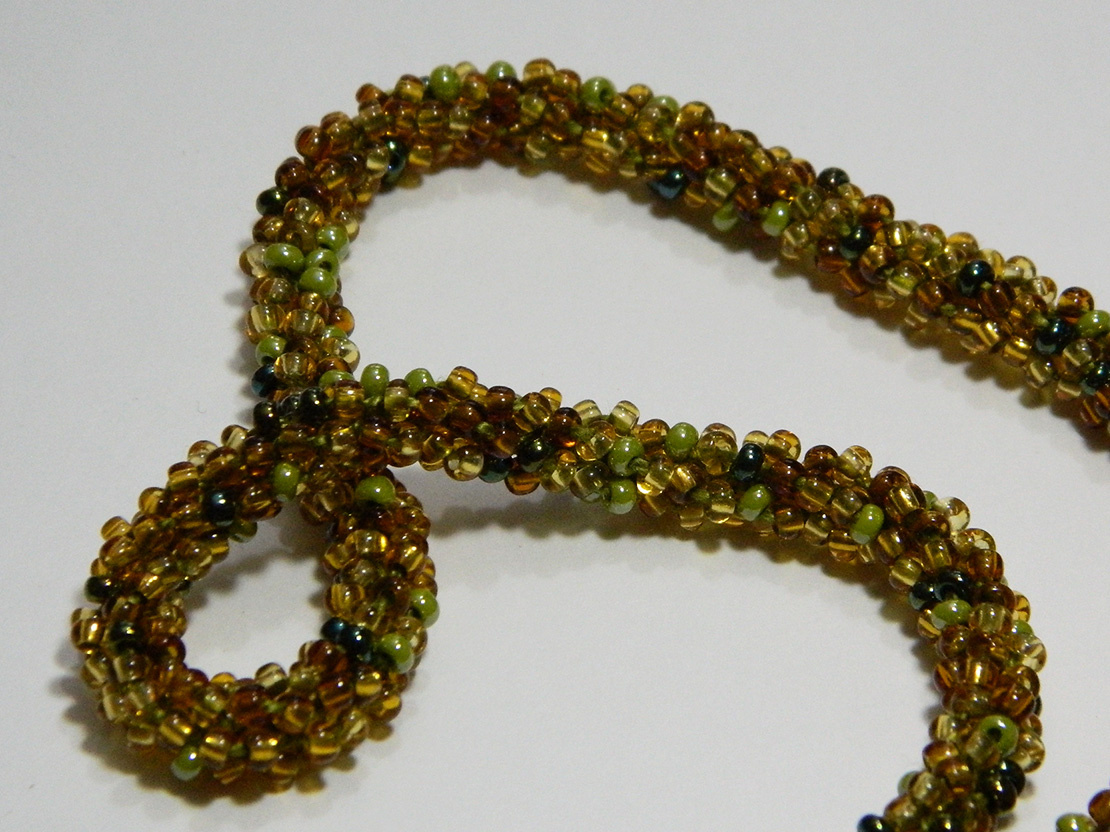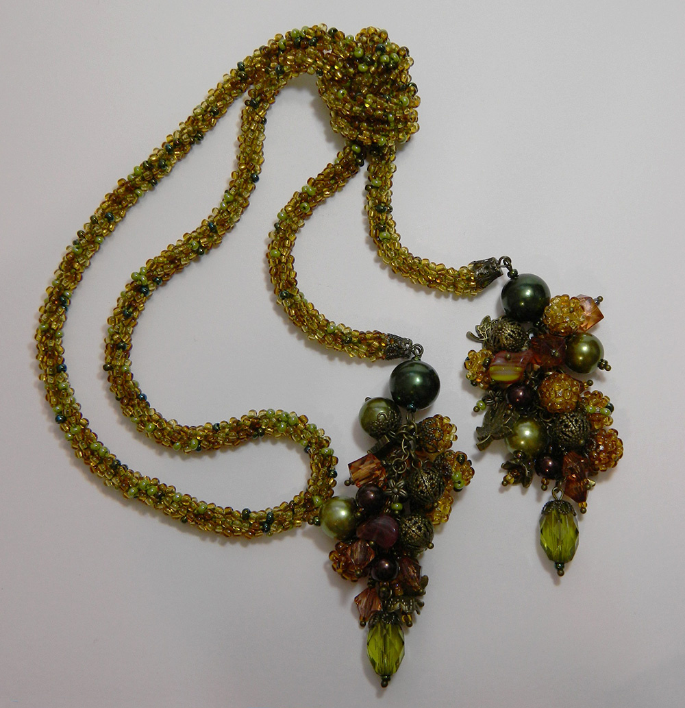В этом лариате использован прием, который очень мне нравится. Для жгута использован микс чешской восьмерки — три прозрачных «топаза» — светлый, средний и темный, — плюс золотые «искры», плюс светло-болотный глянцевый и темно-болотный металлик. Нитка — светло-болотный Ирис, и вот такая нитка, просвечивая сквозь прозрачные «топазы», дает очень интересный цвет, который я для себя обозвала «мхом». Я это сочетание зеленой нитки и «топазов» и в других украшениях использовала. Жаль, фото очень плохо все это передает…