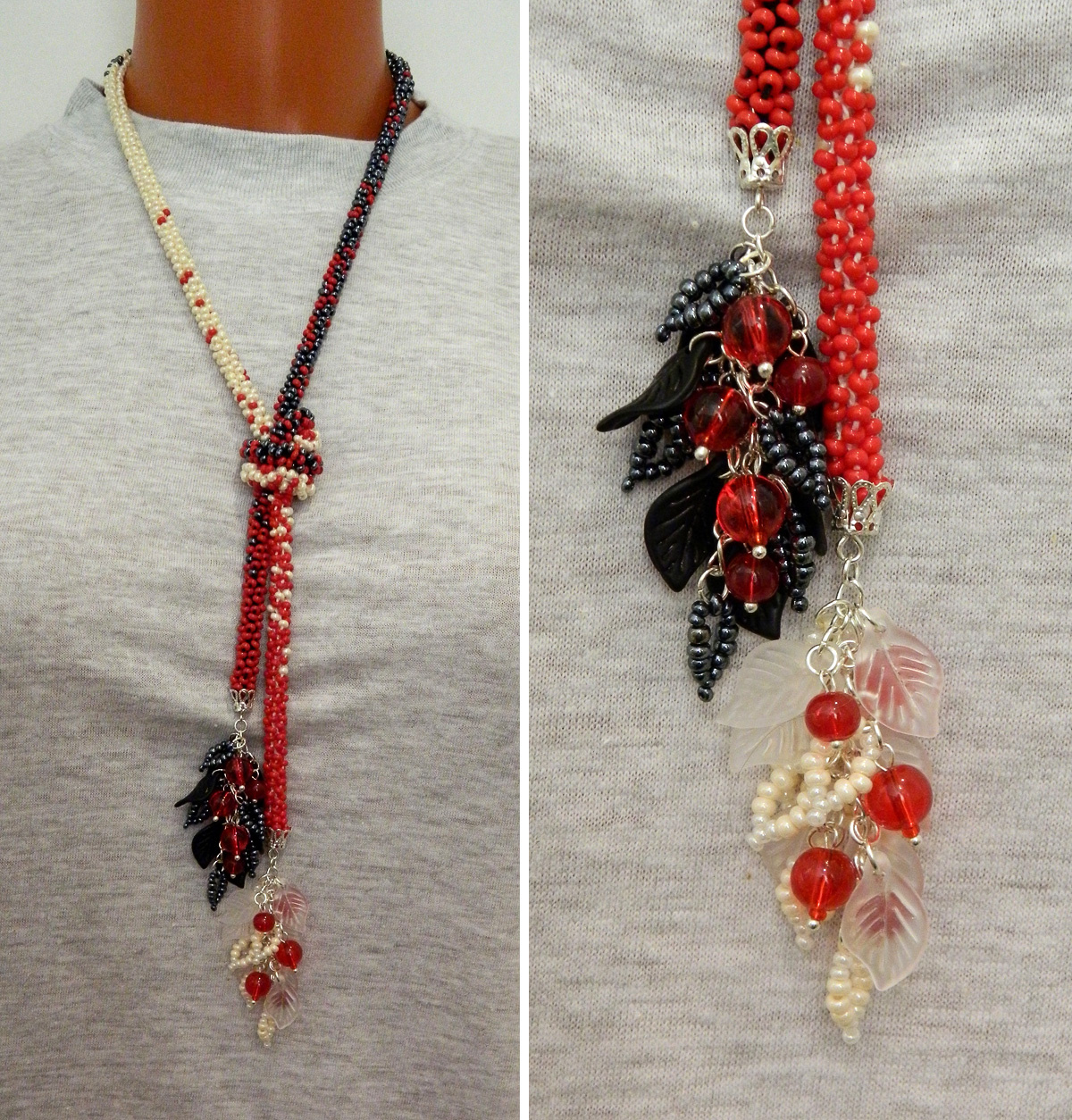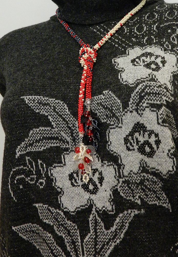 Этот лариат — наверно, самая интересная и сложная из моих работ с градиентом в лариатах. Сложность там была в рассчетах. Идея была в том, чтобы сделать переход от одного цвета в другой с постепенным проникновением. В жгуте использованы две нитки — черная и молочная (чуть желтовато-белая), — и бисер трех цветов — красный, гематит и «топленое молоко». Нитка одного цвета идет до середины лариата, затем начинается нитка другого цвета. А бисер идет так: по белой нитке — красный, потом по чуть-чуть нарастает белый, пока не станет только белый, потом, ближе к середине начинает нарастать гематит, пока весь не вытеснит белый (где-то на переходе — смена нитки), затем ближе ко второму концу начинает прибавляться красный, пока он не вытеснит весь гематит. Я уже не помню, на сколько отрезков был поделен жгут, чтобы сделать миксы с разным процентным содержанием цветов бисера. Потом набирала точно отмеренные отрезки этих миксов (линейкой мерила) на нитку. Жаль, от этого лариата не осталось нормальных фотографий, где был бы виден весь переход цветов. Если бы я сейчас вязала такой лариат, то сделала бы ему хомутик для скрепления. Но в те времена я все лариаты вязала под узел. Есть еще фотография этого лариата на свитере, но мне кажется, что она еще менее вразумительная…