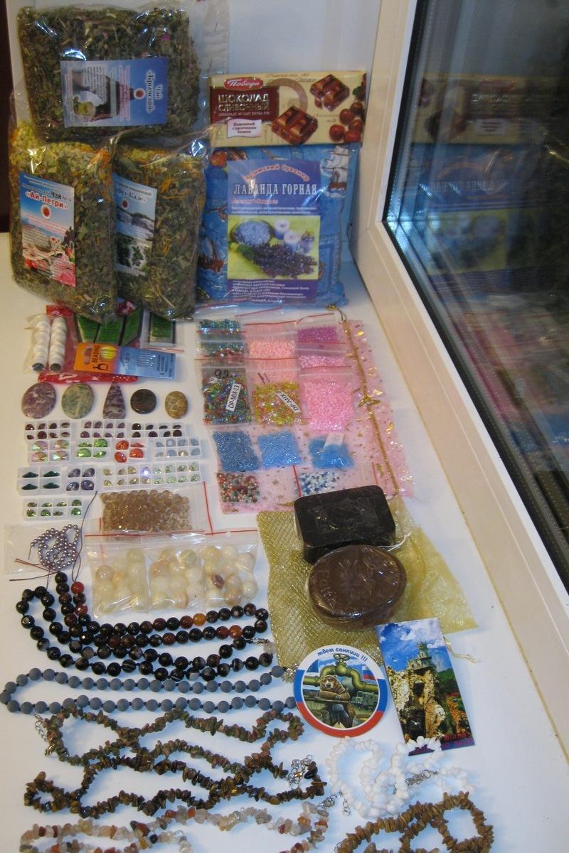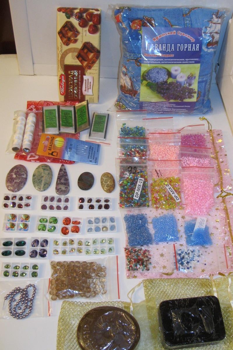 Два набора для вышивки крестом, кучка ханты-мансийских магнитиков, берестяная, я так понимаю, закладка, 7 оттенков тошки разного размера, очень интересные бусинки с цветочками, а еще 2 змеевика, 3 яшмы и 3 сердолика.