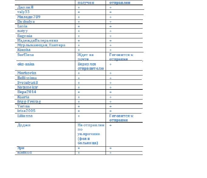 К сожалению есть и неприятное. Подарок в Донецк вернулся не доехав до адресата, подарок для SurElena томится в ожидании на почте. Я надеюсь, что все таки подарки найдут своих адресатов и все будут счастливы.