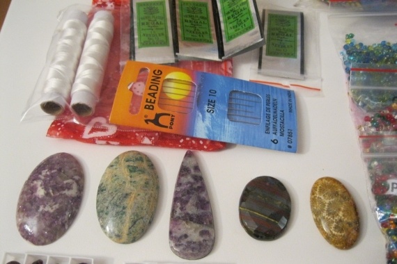 Огромный кусок кожи, как раз делаю сейчас большое колье, примерила и как раз то что нужно, подошло! Тоненькие иглы, без них никуда, мои запасы уже были на исходе, что приходилось откладывать работу. Камушки — кабошоны и маленькие и большие. Маленькие особенно люблю, так как ими можно акцентировать внимание или добавить последний штрих в работу