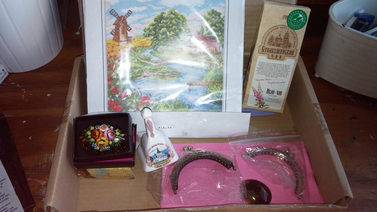 Отчитываюсь! получила посылку, ура! квиток пришел вчера, с пометкой " получить на завтра после 10 утра", да, есть у нашей почты такой вот трюк, для особо «терпеливых». по треку проверила что из Нижнего Новгорода.по списку игроков посмотрела кто же, думаю это Лаерта, Света, спасибо огромное.Короче, дочка получила утром, звонит, говорит посылка такая большая как половина твоего стула рабочего , ну ребенок говорящий на полурусском и на так может описать, прислала мне фотку , вот добралась и я с работы. вот, любуйтесь, завидуйте это общий план, там есть фермуры 2 , брошечка с русской росписью , колокольчик для коллекции , и набор для вышивки крестиком , все мечты, в добавок еще симбирцитик , я такое чудо еще никогда в руках не держала, чай из Иван чая, такое у нас не продают. хоть попробую.Я в полнейшем восторге от подарка, Света все угадала. А еще вы верите в знаки, мы вот с мужем думаем поменять диван, много вариантов, в том числе и икея, а тут распаковываю посылку, а там коробка из икеи, вот и не верь после этого в подсказки. Еще раз спасибо моей феечке, и Тане за игру.