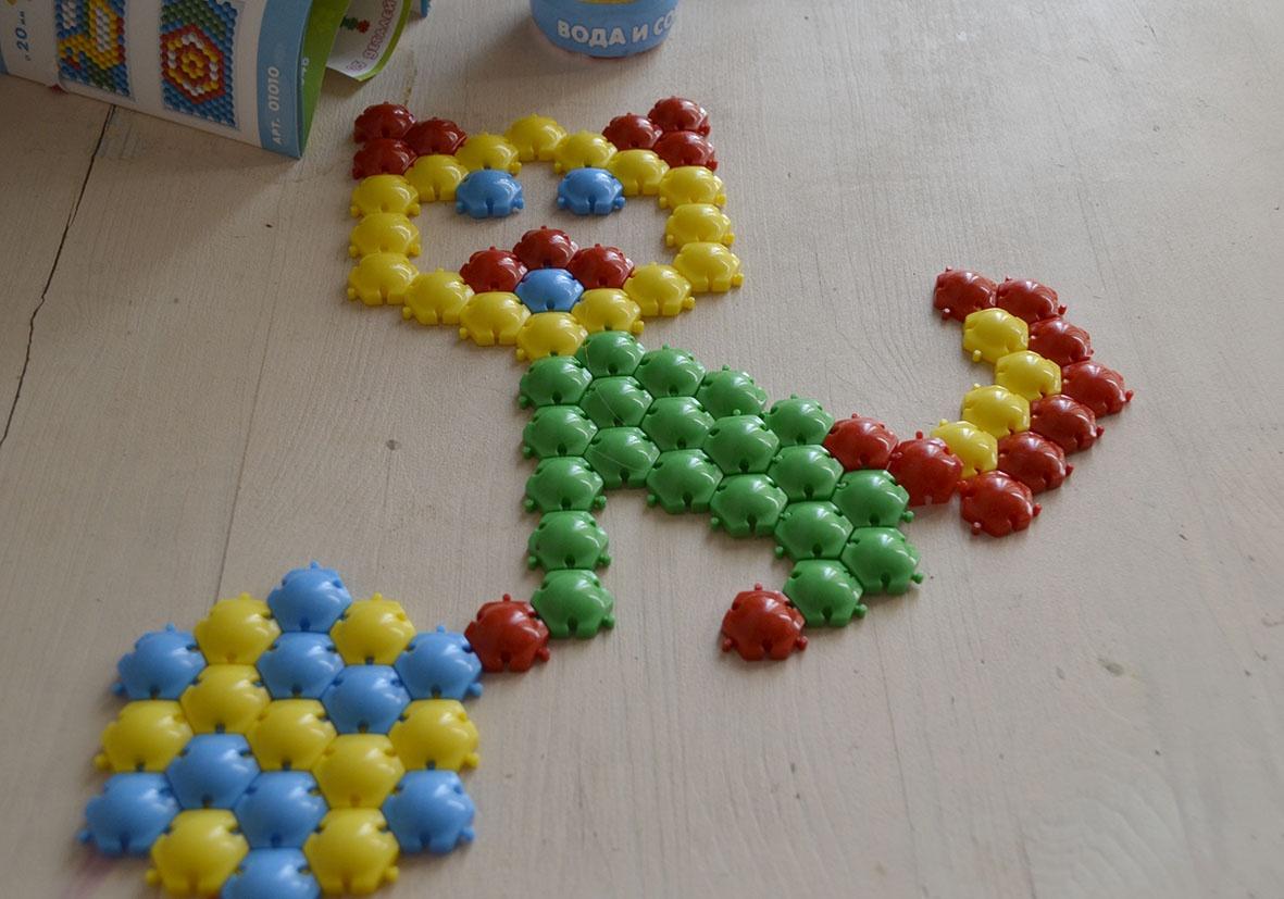 На самом деле в посылки были замечательные краски, кисти и бумага для рисования, но когда я решила, все это сфотографировать, то на вопрос где краски, получила ответ – в кабинке в школе, а сейчас каникулы, так, что краски были, но они в кабинке в школе. А мозаика превратилась в кошку.