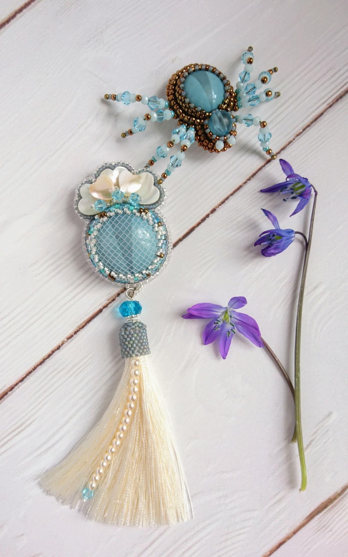Броши небольшие и легкие: цветок длиной 12 см вместе с кистью, шириной 3 см, паучок: длиной 3 см и шириной (по размаху лапок) 6 см.