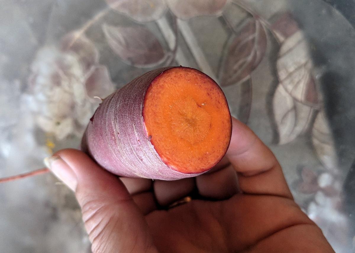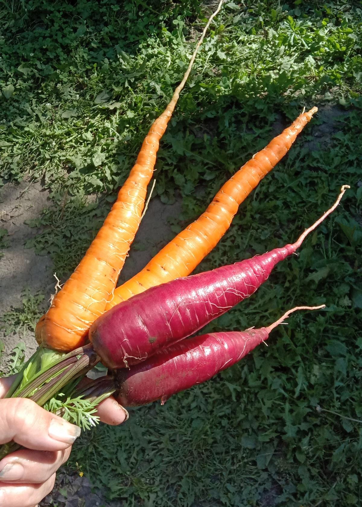 Морковка красная называется «Карамель». Красная у нее только кожица, внутри она оранжевая. Может, чуть понасыщенней, чем обычная. Сердцевины почти нет. На вкус, действительно, карамельная) Очень сладкая и сочная. Кстати, я морковку раз 5 за сезон обязательно с солью поливаю. Как ни парадоксально, но она от этого становится слаще)) И свёклу тоже)
