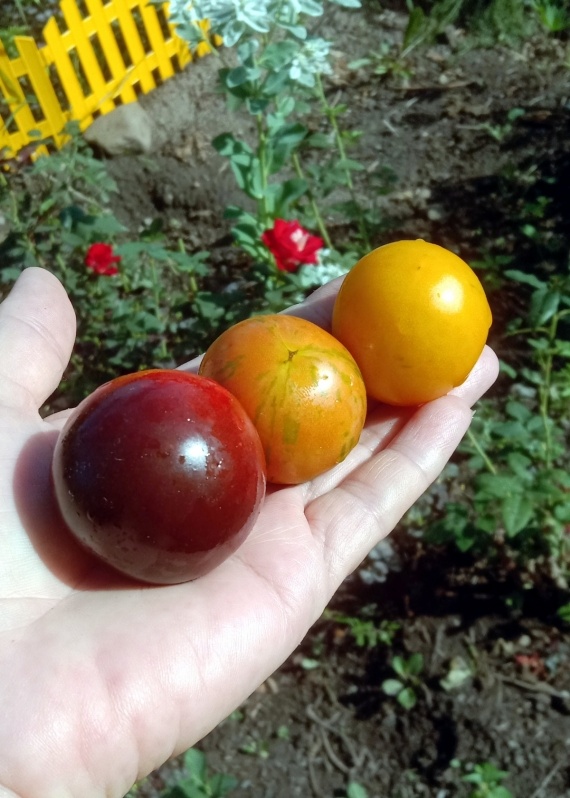 В этом году посадила еще антоциановые помидоры на пробу — Голубая Лагуна и Уголек. Буквально по 5 кустиков каждого сорта. Плоды офигительные (пардон за сленг), сладкие и мясистые. Сперва черно-фиолетовые, по мере поспевания добавляется карминно-красный. Очень сладкие, вообще без кислинки. Сорт одобрила, для постоянного выращивания беру! Вот здесь их видно — самые темные.