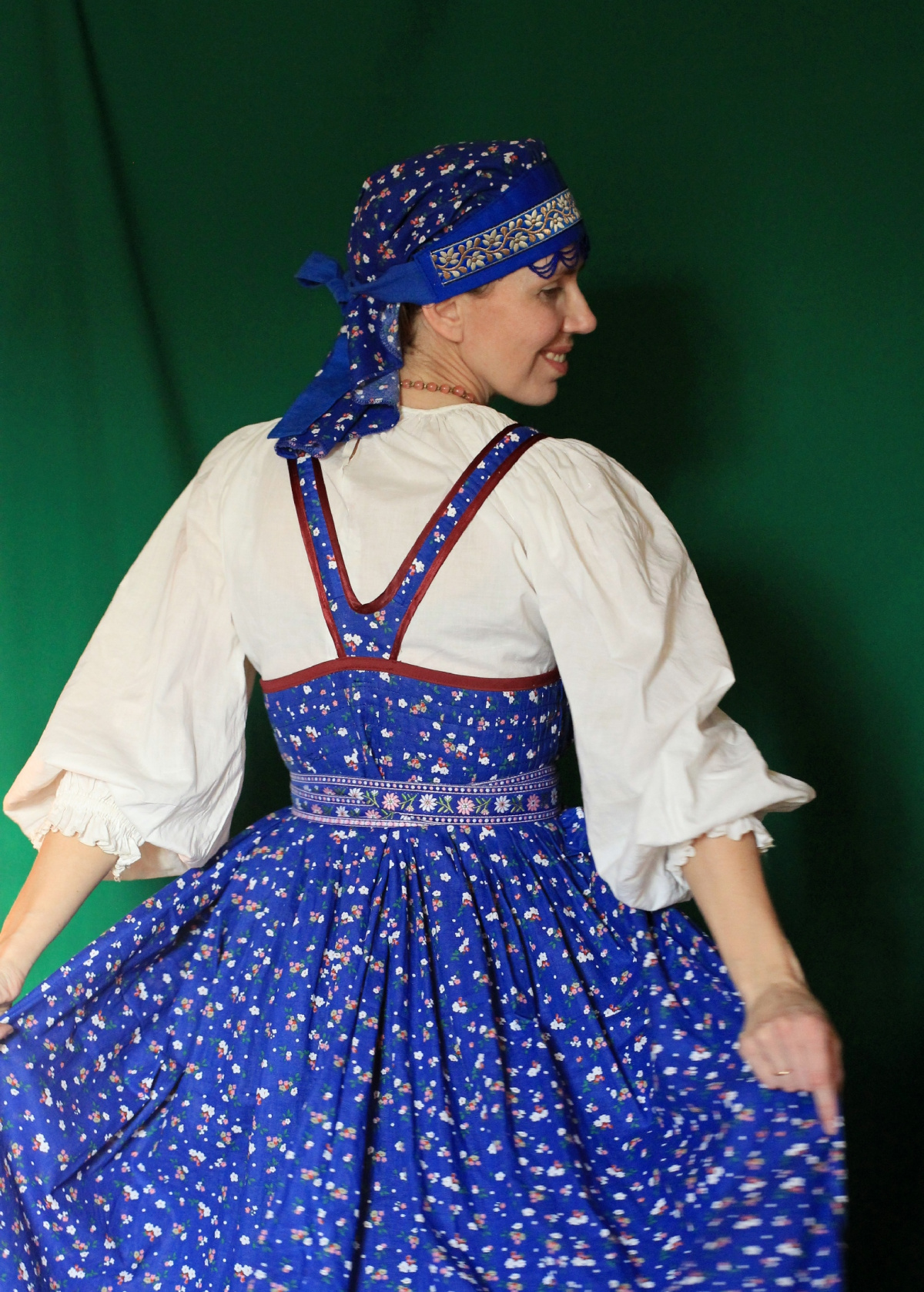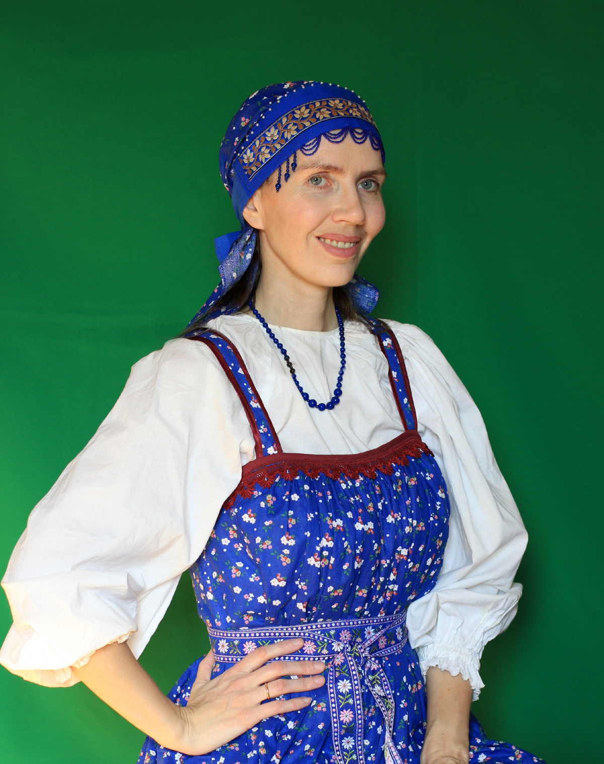 И синие бусики просто класс! Сюда ещё чисто красные будут хороши. В общем, не прячьте этот наряд, а носите его с удовольствием и не только на фестивали и конкурсы. Надо гордиться нашей русской культурой. В ней много достойного.