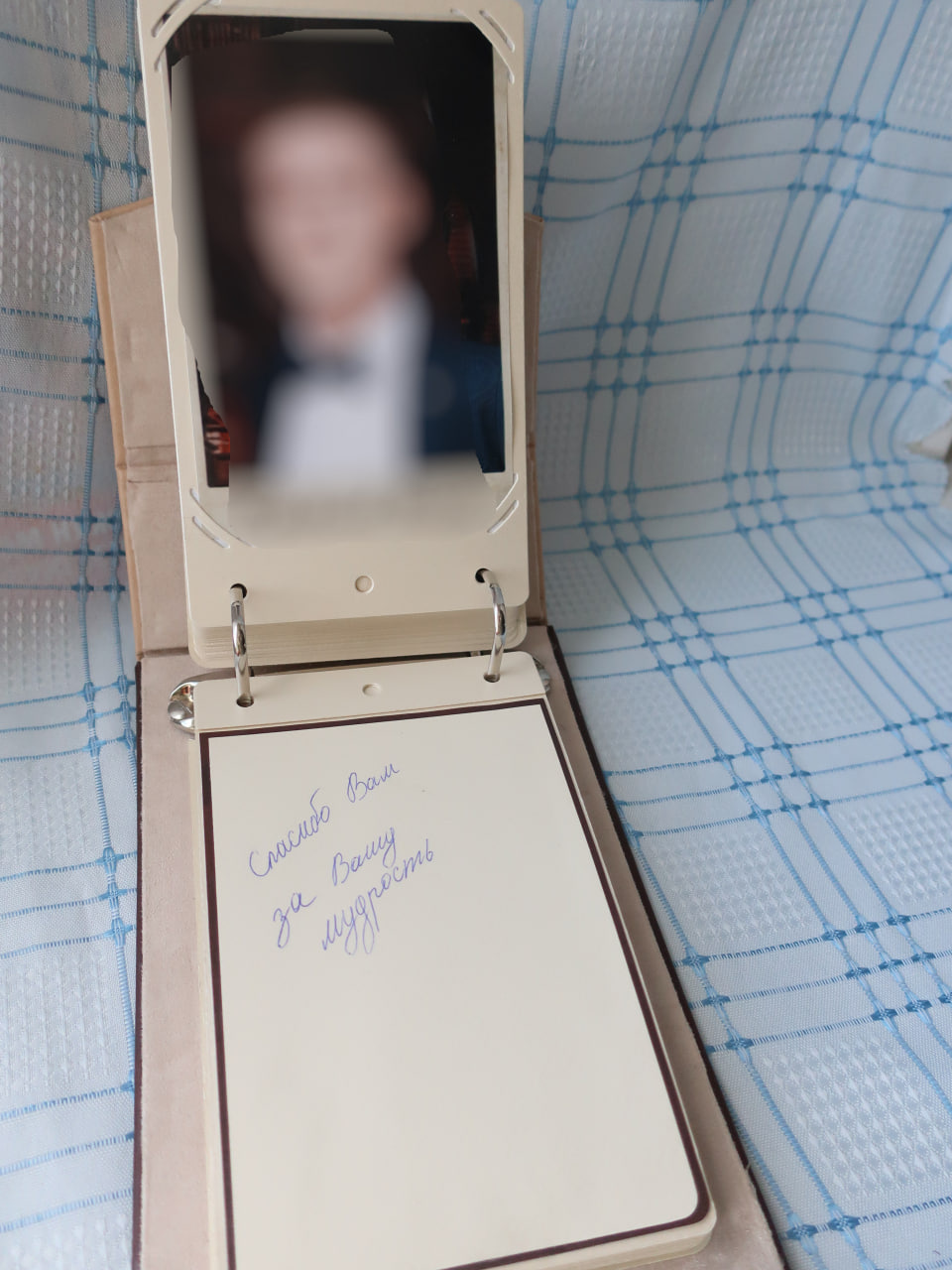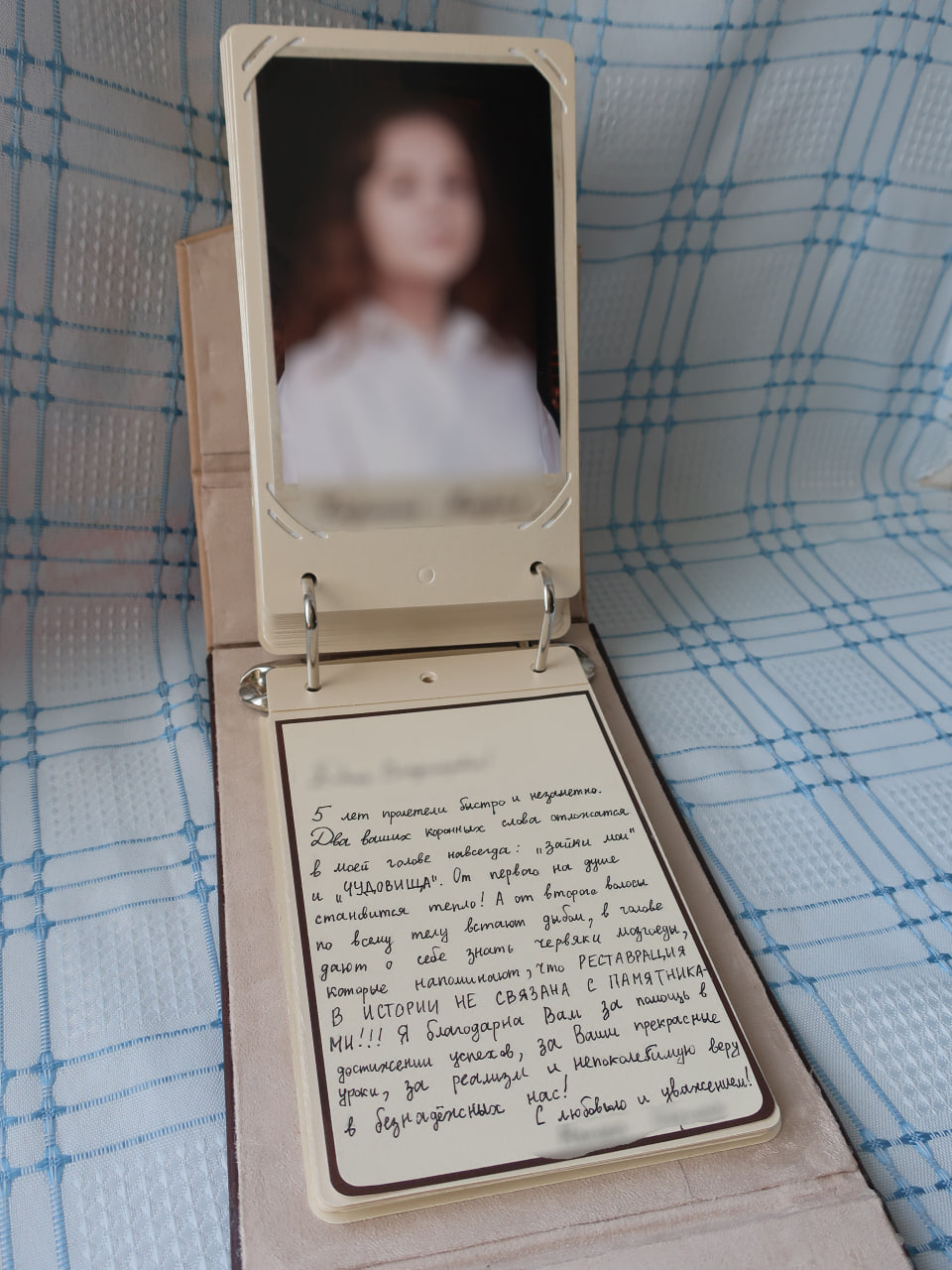 На каждом развороте с одной стороны фото ребенка размером 10х15. Детям делали на выпускной фотокниги, сразу и заказала там же печать портретов с вписанными именем и фамилией. С другой стороны разворота — несколько слов, написанных этим ребенком для учителя. Пожелания, слова благодарности или просто свои мысли. Главное условие — написано должно быть от руки самим ребенком. Ограничение — размер листа. Кто-то написал пару слов. А кто-то свои мысли еле на листочек впихнул.
