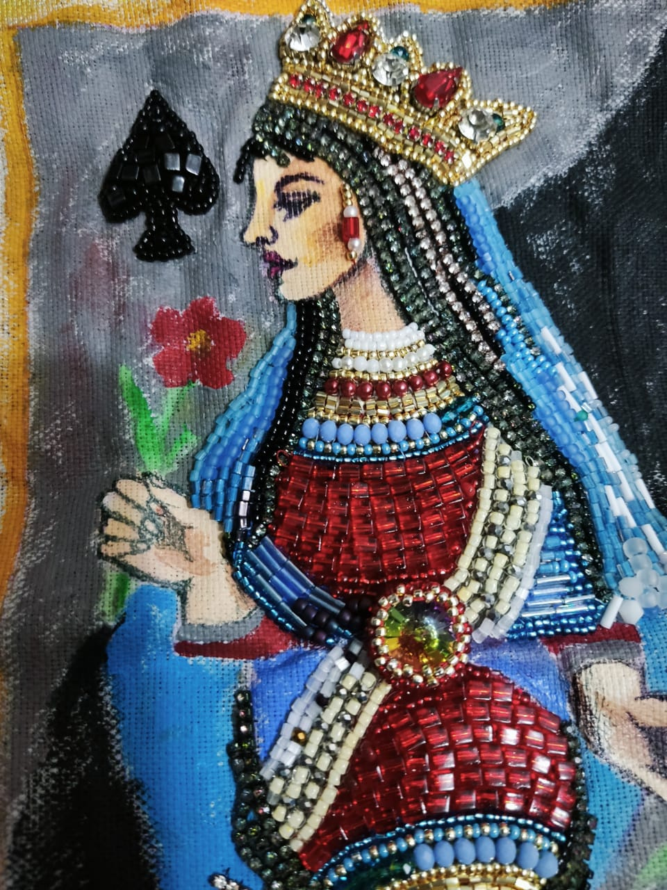 Эту даму закончу, в планах еще и остальные (черви, бубны и крести), может, там тоже с лицами заморочусь) Да и фетр куплю, надобность в натягивании отпадет.