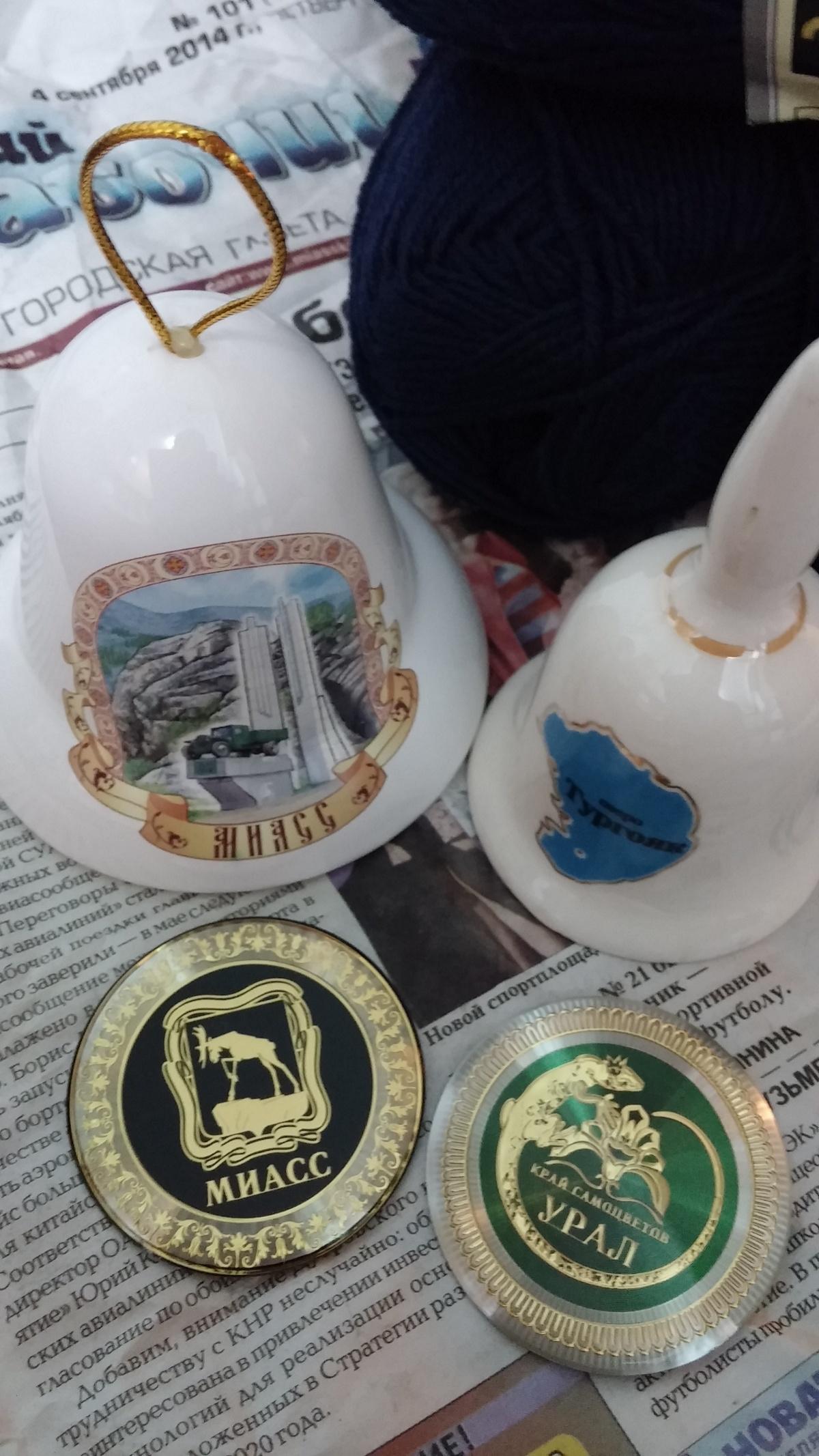 я такая радая, такая радая! мне пришла посылка!!! от Оли Uralola, после того как я на флешмоб про коллекции показала свои колокольчики, Оля спросила есть ли у меня колокольчик с Миассом( ну это мой родной город, а она там живет), нет, не было у меня колокольчика с Миассом, попросила она мой адрес, и та дам теперь у меня есть 2 колокольчика с Миассом, а еще 2 красивых магнитика, и еще прям говорить не могу от восторга пряжа шерстяная, чудного цвета, прям специально мне для шарфа- шали, и еще открыточка красивая, а в ней поздравления прям вот так от руки написаны.