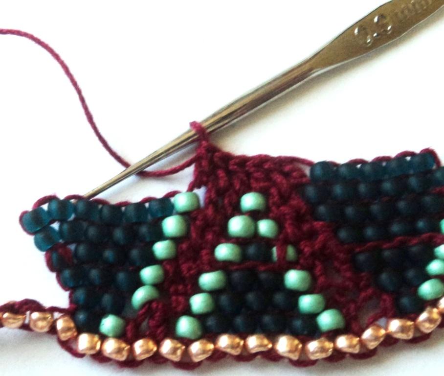 итог, бисерная часть иглой(кирпичик), после переход на крючок -два столбика, закрытие петли после крючка, протаскиванием иголки с ниткой через петлю, дальше опять столбик…