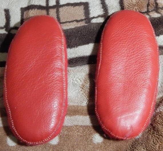 А тапочки я подшила просто. кусочек кожи подклеила вначале. Клея минимум, чтобы кожа не двигалась при пришивании, а потом швом обметочным, через край )))).