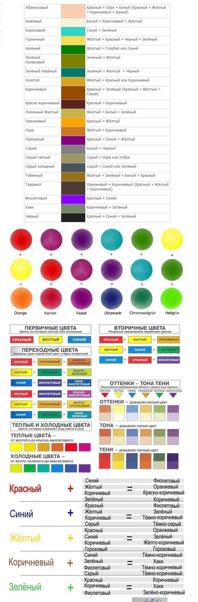 По поводу смешивания цветов, — на ютубе есть ролик «Как смешивать цвета? Вся палитра из трёх цветов».