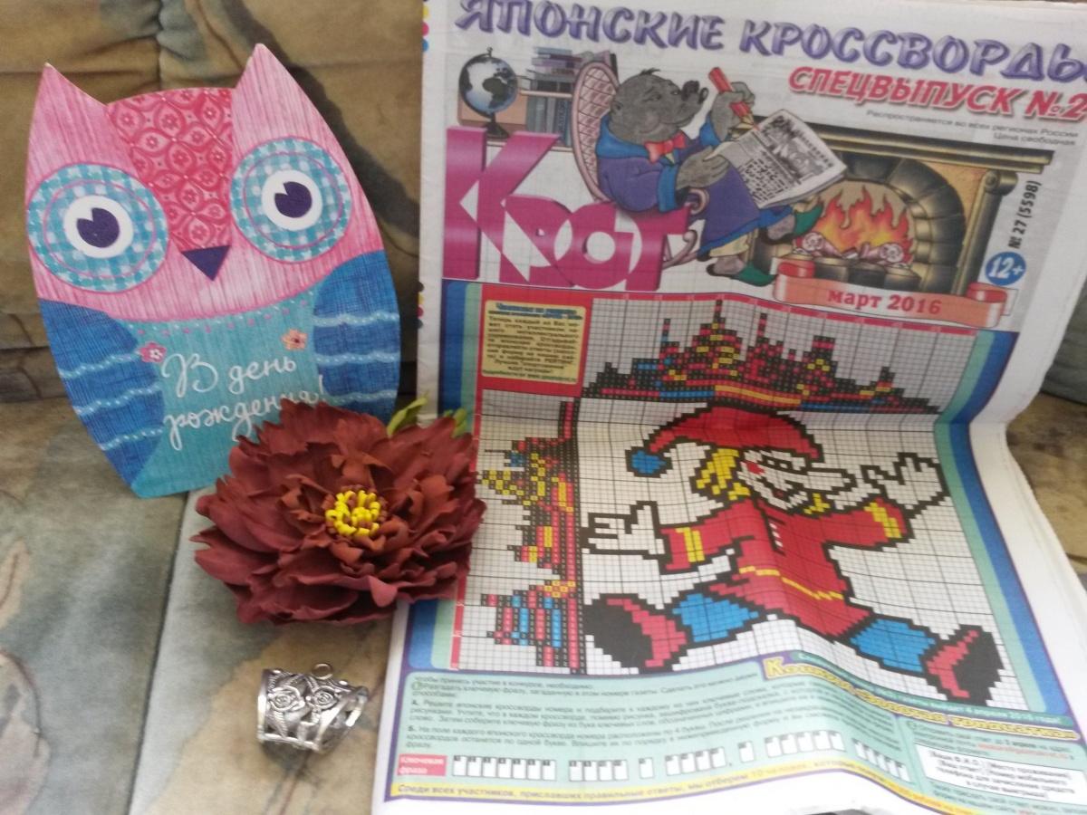 А еще там чудесная открытка в форме моей любимой совы, и обожаемые японские кроссворды, и большой замечательный бейл!