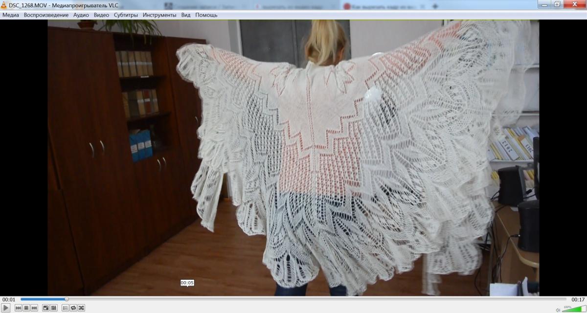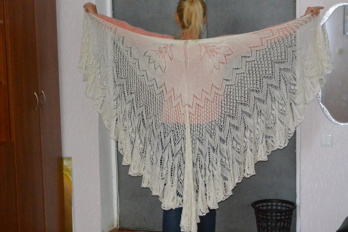 Летняя шаль Саана. Схему брала на сайте СтранаМам. Связана спицами из льняной нитки в два сложения. Не знаю, чего больше потрачено нервов или уговоров самой себя (особенно после первой трети шали). Итог — моральное удовлетворение и обещание (опять же себе самой) еще год, как минимум, не брать в руки тонкие нитки. Шаль обитает на работе. Летом накидываю, когда плечи уж сильно открыты, а кондишн выключить категорически невозможно (в комнате сразу 30 и выше, + вонь от ксероксов). Складываю ее пополам или как на фото крестом на плечи. В размахе около 2,7 м.