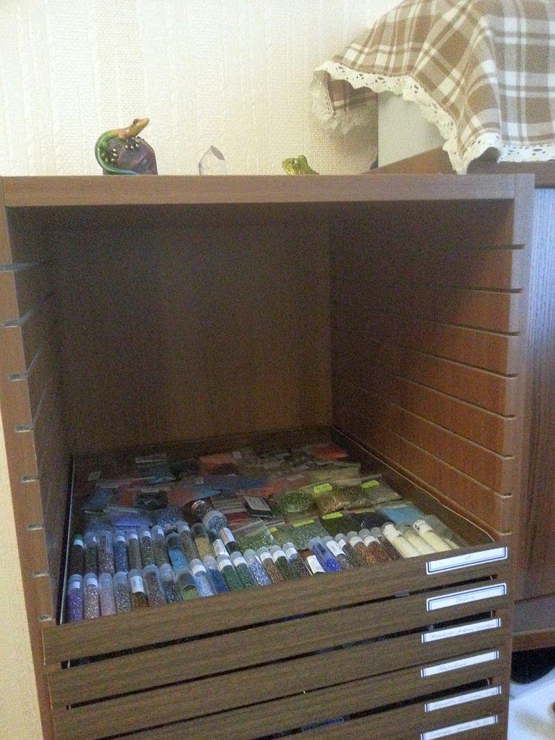 Можно сказать, что мне повезло. В магазинчике, который торгует остатками мебели, увидела у стола хозяина пару тумбочек с прорезями для фанерок. Похоже, он туда складывал какие-то лишние бумажки. Набралась наглости и поинтересовалась, нельзя ли такое купить. Хозяин сильно удивился, но быстро сориентировался, и на следующий день тумбочки приехали ко мне. Вот здесь видно, как выглядят прорези: