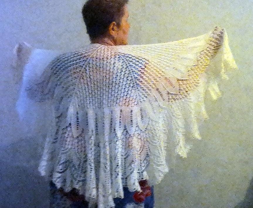Первый пришел от Ольги (maik) по большой игре. Она прислала мне умопомрачительную белую шаль Грета