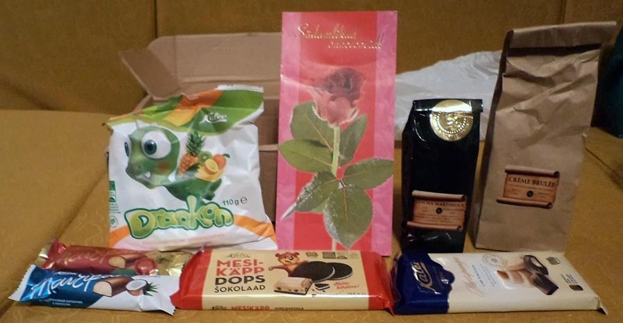 Всевозможные вкусности для начала. Чаи, шоколадки эстонские (вкуснющие, одна — та, что с печеньем, — осталась уже в воспоминаниях, остановиться невозможно. Самая вкусная из шоколадок с печеньем, которые я пробовала, и шоколад настоящий: снизу слой тёмного, поверху белый), батончики марципановые (любите ли вы эстонский марципан так, как люблю его я? Вооот. Даже начальница моей матушки от него в полнейшем восторге