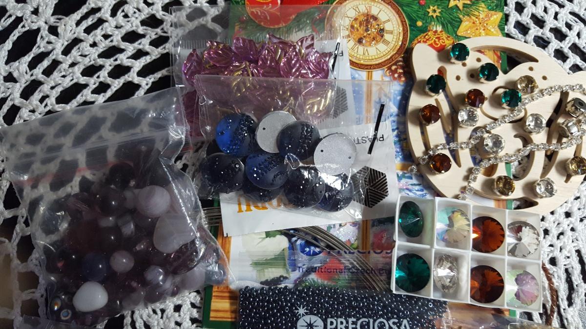 Ну а как же без хомячьих радостей! Тут и бусины, и бисер самых полезных цветов, и стразы, и риволи, и фурнитура — все совершенно небходимое и «вкусное». И душевная открыточка от Томы.