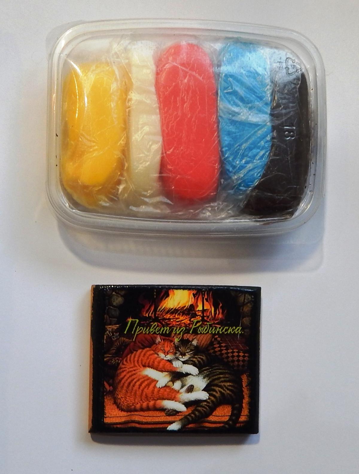 Шикарный магнит и штуковина, которую мы поначалу приняли за пластилин. Но это оказался вовсе не пластилин, а съедобная паста, из которой можно всякие украшения для тортиков лепить. Сейчас чуток вирус победим, и чего-нибудь на кухне сотворим эдакое)))