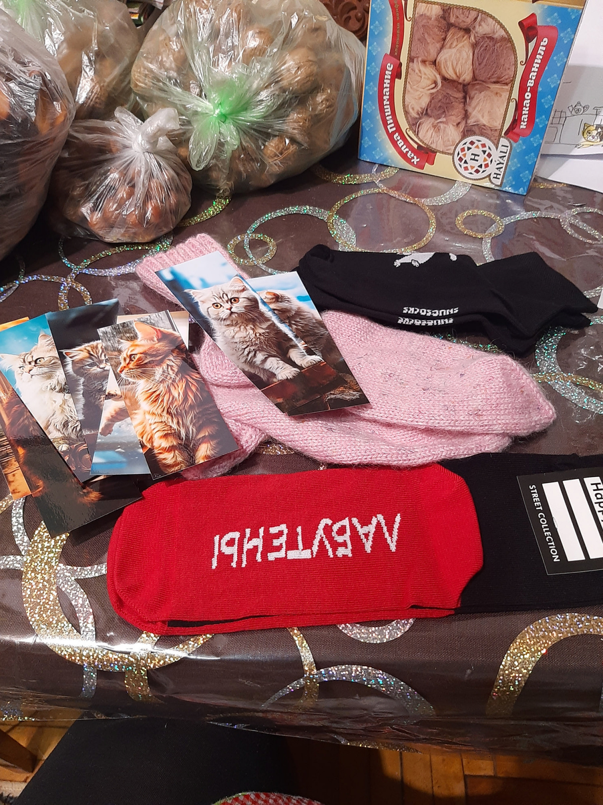 кучи вкусняшек, носочки разнообразных фасонов, мыло