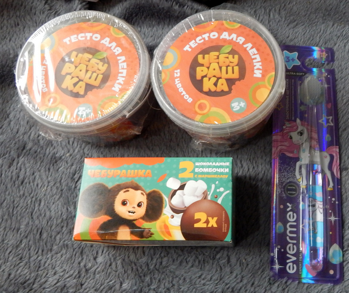 Тоже ей — тесто для лепки, вкусняшки и зубная щетка с единорожкой.