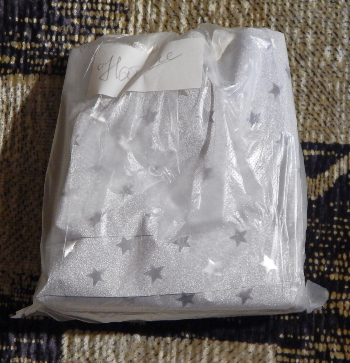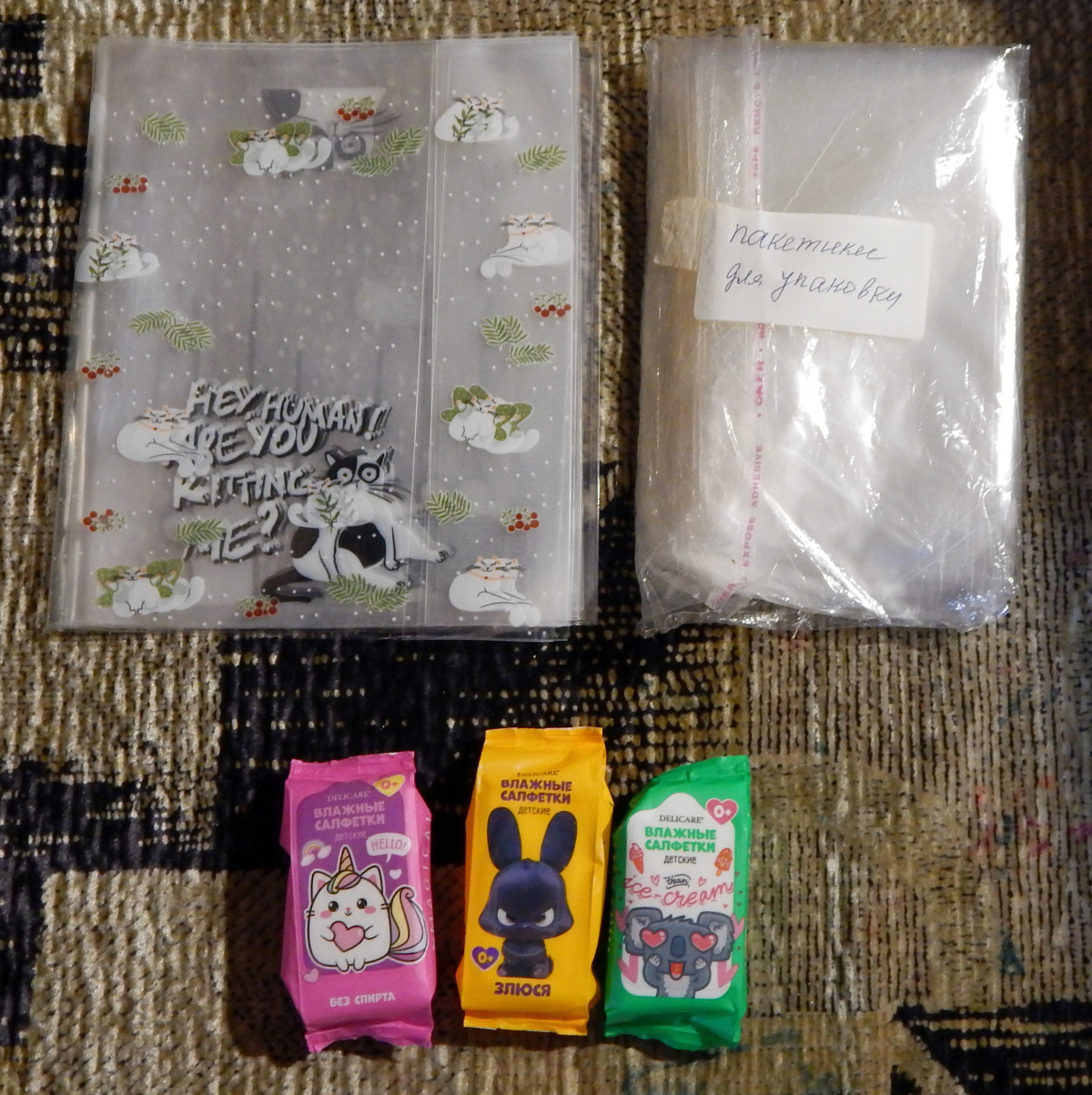 И в завершение вытащили три пачки влажных салфеток, маленьких, идеально в рюкзак в школу. Пачку прикольных обложек для тетрадок и стопочку упаковочных пакетов, которые вообще никогда в подарочном хозяйстве не лишние)