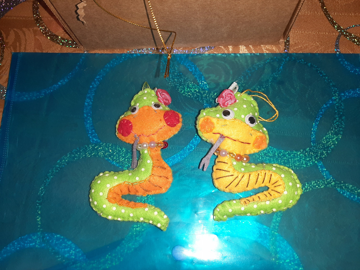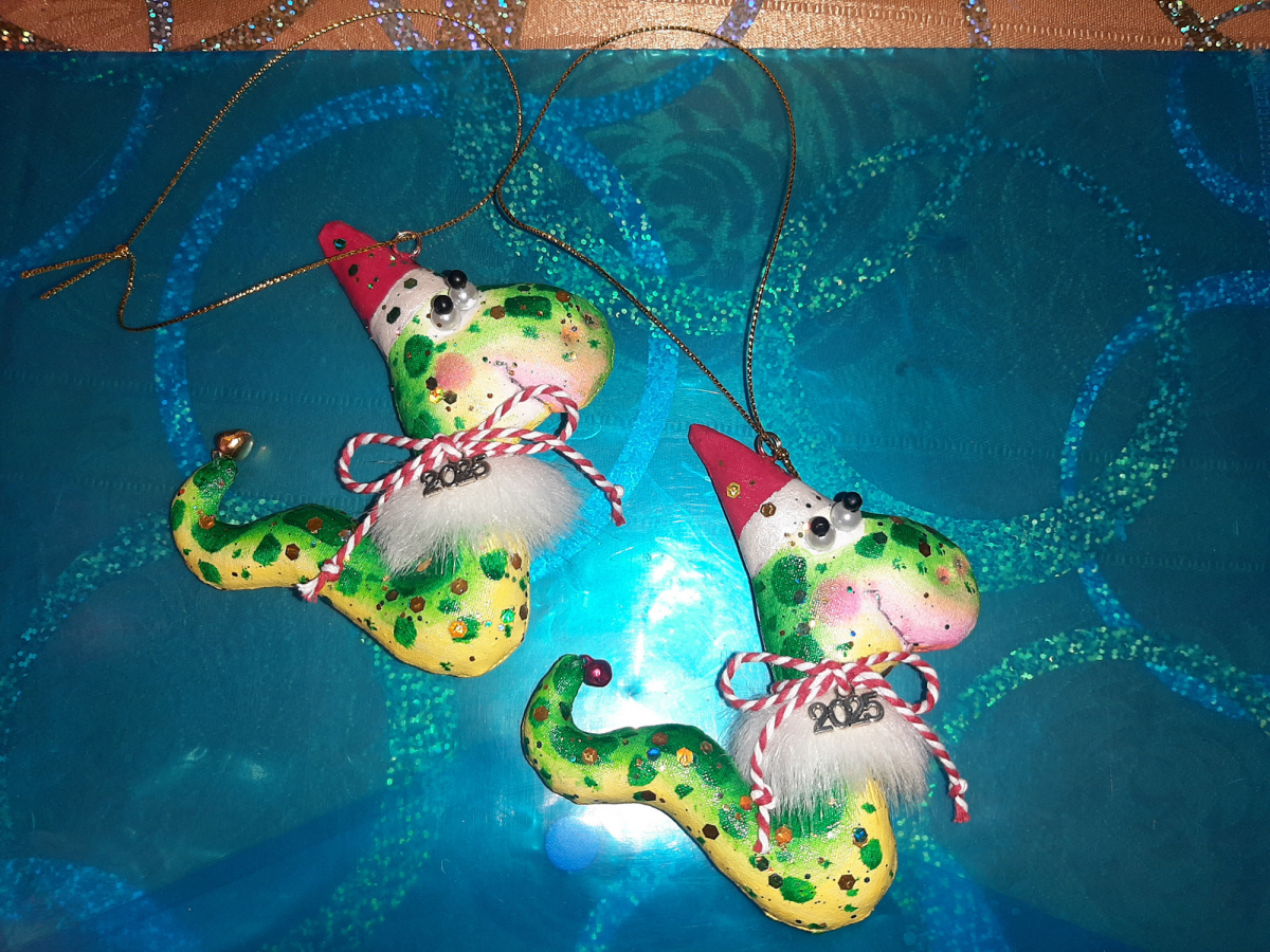 змейки в технике Грунтованный текстиль от Натальи Воронцовой из Одинцова, у Наташи великое множество игрушек на елку в этой технике, они легкие, яркие, для детей маленьких безопасные