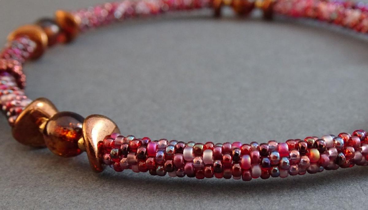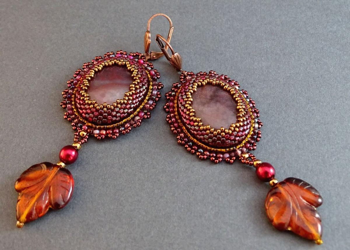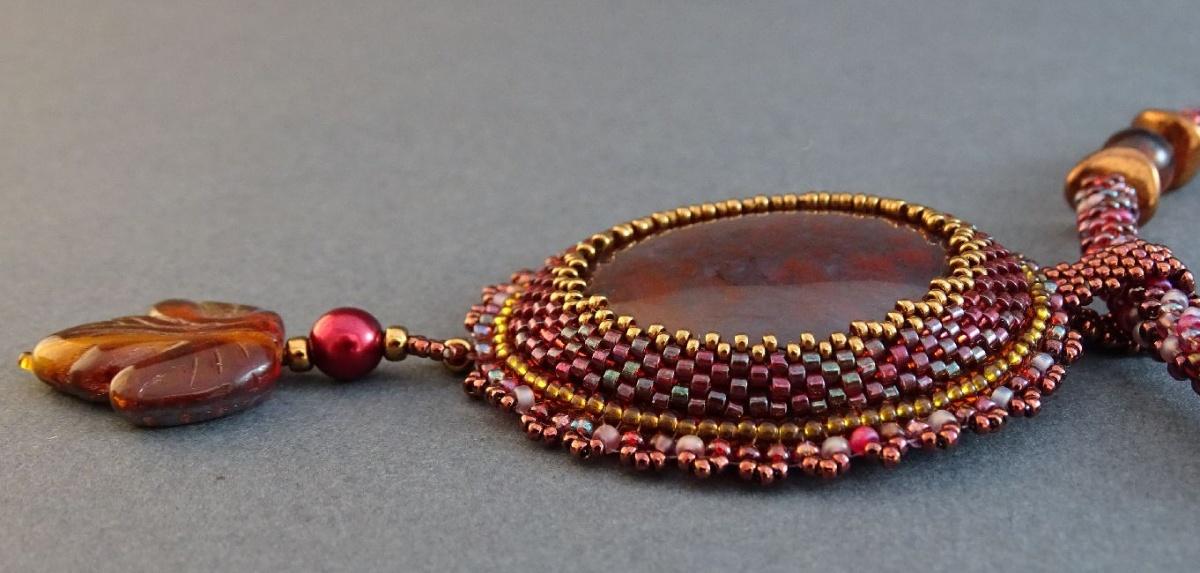 Комплект выполнен из кабошонов коричневой яшмы, чешского и немецкого стекла, японского бисера, мемори-проволоки и медной фурнитуры.