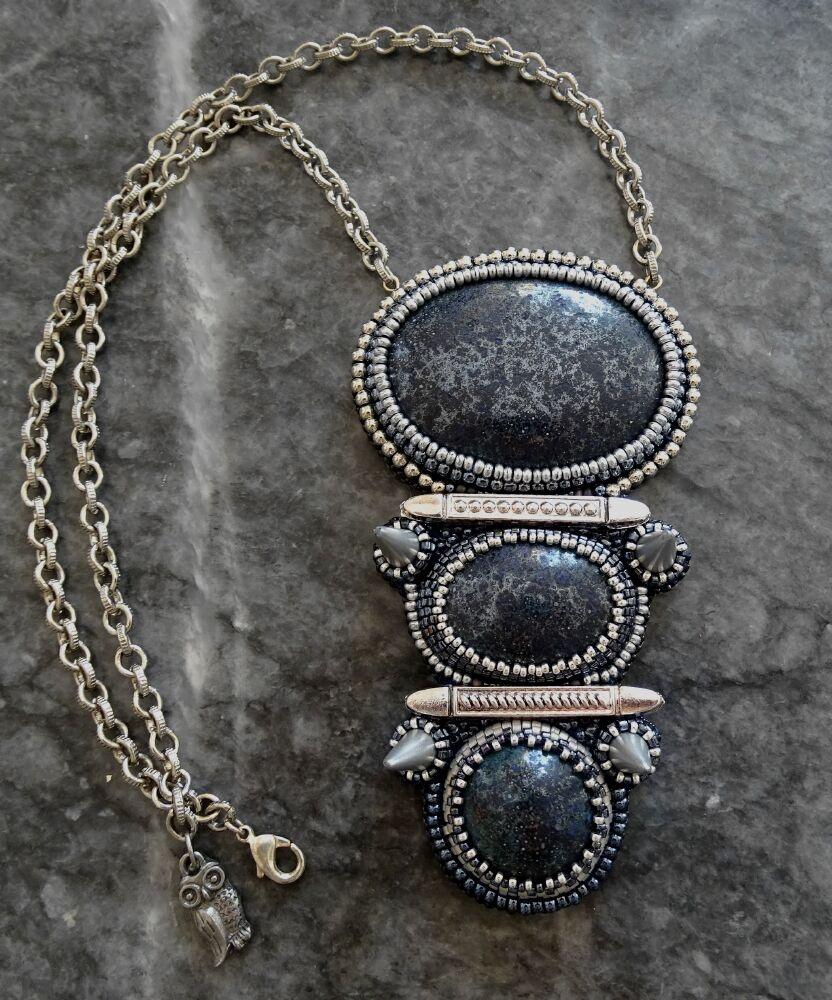 Моя подруга-керамистка предложила попробовать создать вещь с керамическими кабошонами. Первый блин вышел, как ему полагается, комом, кабошоны разной высоты. Глазурь отливала синим, и я хотела обшить их синим бисером. Приклеила на синий фетр, вертела так и эдак, отодвигая синий бисер все дальше. В итоге отказалась от него совсем, зашила все гематитом и серым металликом. А фетр-то остался синим! Правда, видно его только на ярком солнце и совсем чуть-чуть, и можно даже представить, что это он кабошоны оттеняет. Ну что ж, в другой раз буду думать головой.