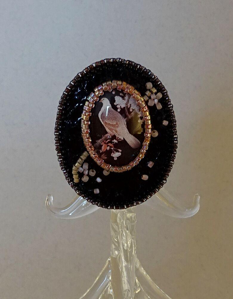 Голубка в японском стиле, вышитая на блестящей змеиной коже, выглядит вживую как лаковая миниатюра. На фото, к сожалению, не выглядит никак. (Заметка на будущее: вышивать змеиную кожу — все равно что вышивать пергаментную бумагу. Тонкая, сухая, рвется, ошибок не прощает).