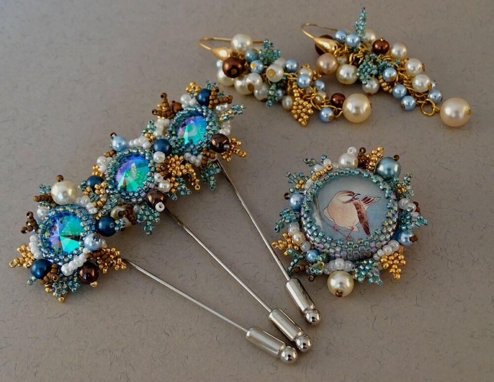 Целая стайка воробьев (сначала сделала брошь и серьги, а потом оказалось, что артистов было пятеро, и пришлось добавить булавки):