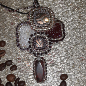Немного с ним припозднилась, в основе-две разноразмерные пуговицы со стразиком, подвеска-яшма, весьма темная, но это все, что нашлось подходящей фактуры и размера