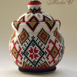 Шкатулка и яйцо с мордовскими узорами. Начала оплетать крышечку от шкатулки и поняла, что она ассиметричная, ручка у крышки находиться не в середине, а чуть сбоку. Пришлось поколдовать немного....