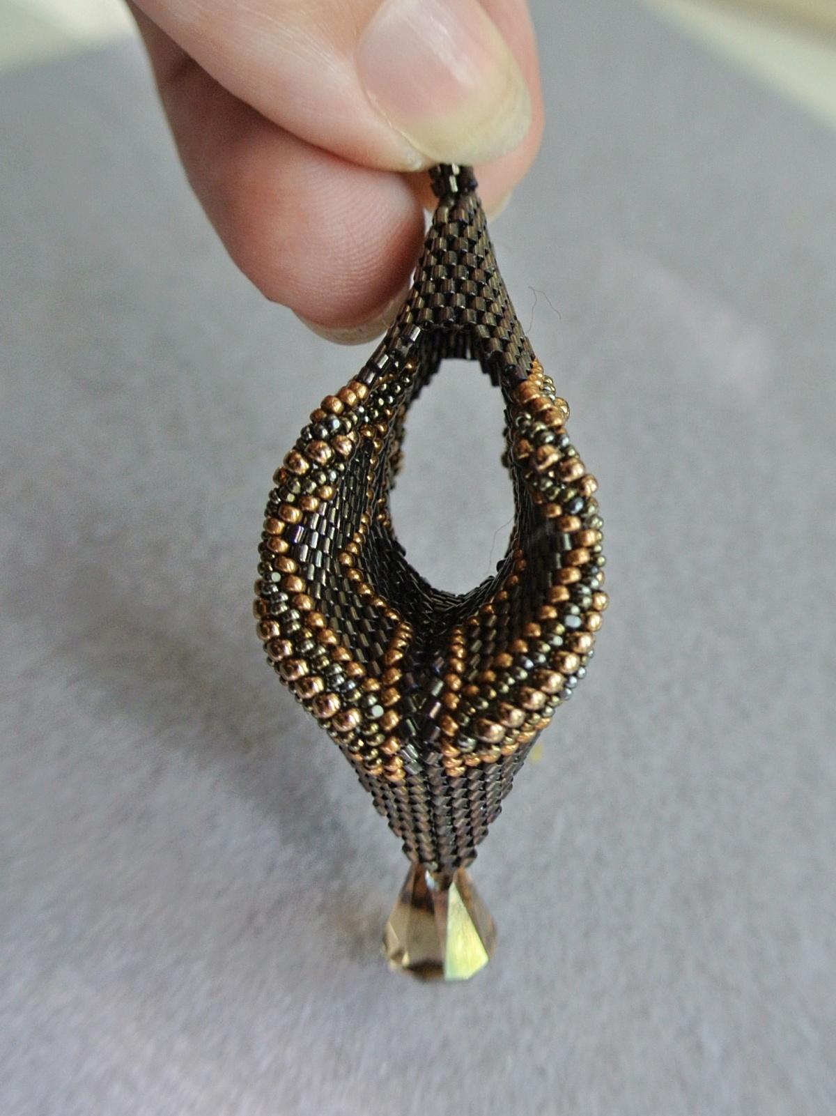 И мне понравилась получившаяся штучка. А дальше я заплела центральную дырочку, соединила мозаикой два верхних уголочка и подвесила внизу подвеску сваровски. И вот результат: