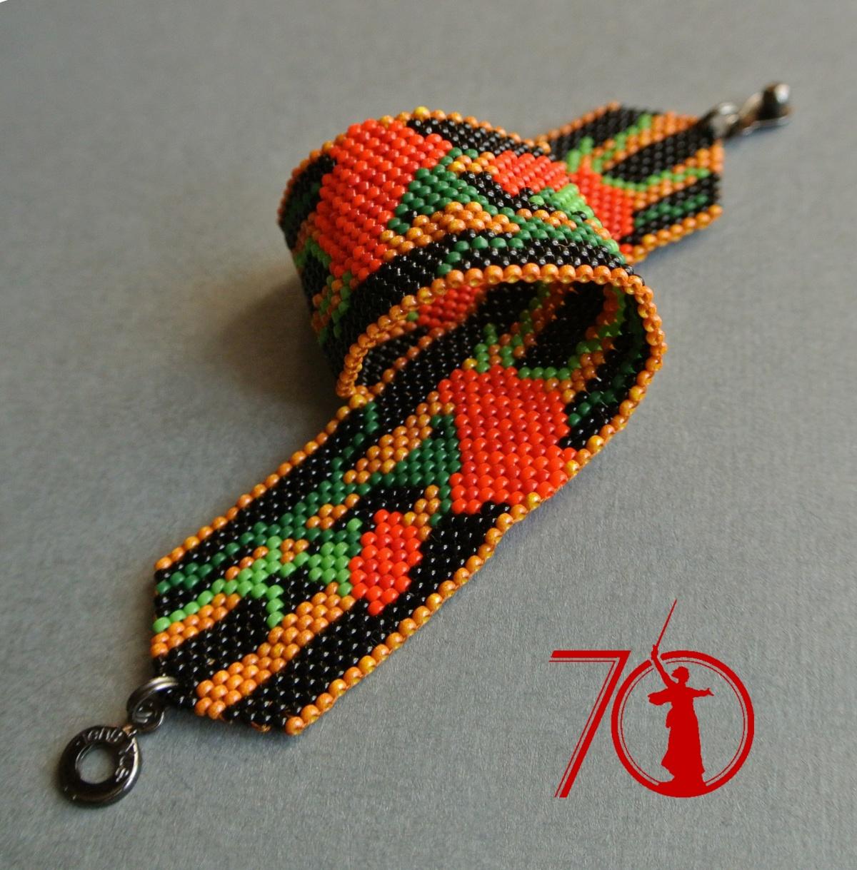 Схема мне очень понравилась! Плела из пятнашки Тохо и Миюки. Но всё же я пришла к выводу, что для мозаики лучше брать делику. Т.к. немножко браслет покоробило. Но оранжевой и красной делики в моих запасах не оказалось(