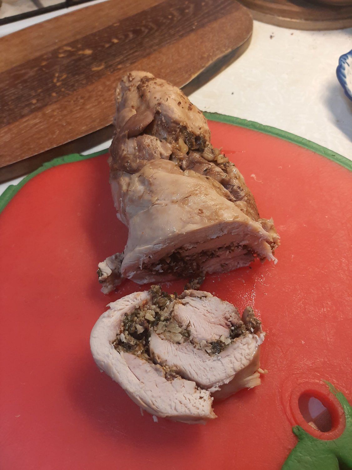 присыпать курицу чуток сухим мелким желатином, выложить начинку и свернуть туго рулетом