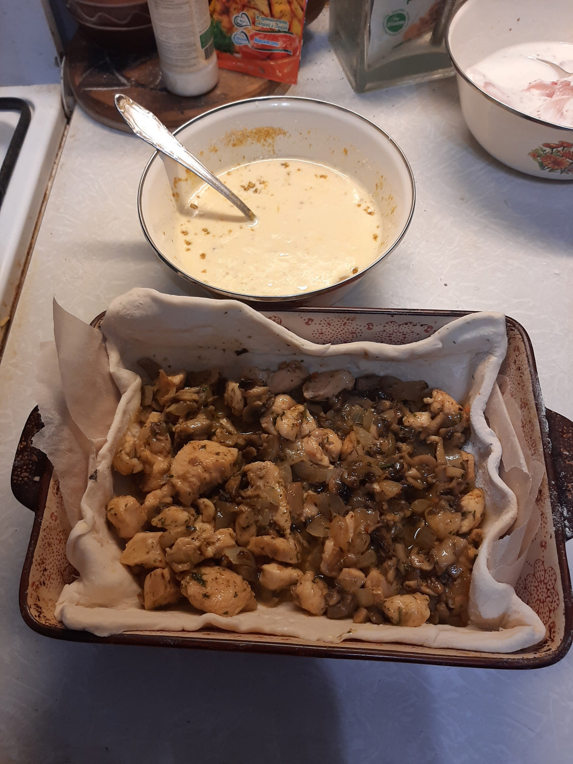 В форму кладем лист теста, чтоб бортики были, потом курицу с грибами, залили и в духовку на 40 мин при 180 гр, я немного жидковато сделала, не увлекайтесь сливками, все просто и весьма быстро, но вкусно, попробуйте