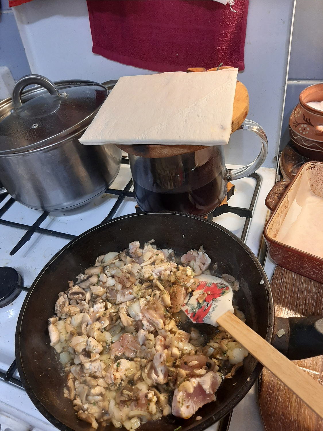 курица и грибы и 1 луковица-обжарить на масле мин 10