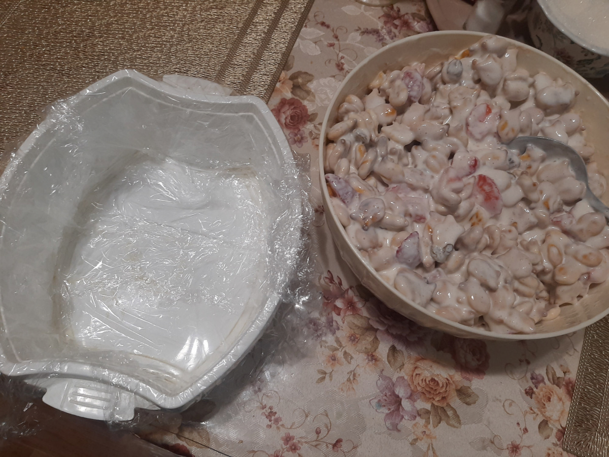 простелить емкость пленкой в 2 ряда, чтобы края свисали, плотно набить емкость массой, прижимая ложкой, прикрыть пленкой и еще руками прижать, убрать в холод на 4-6 и более часов