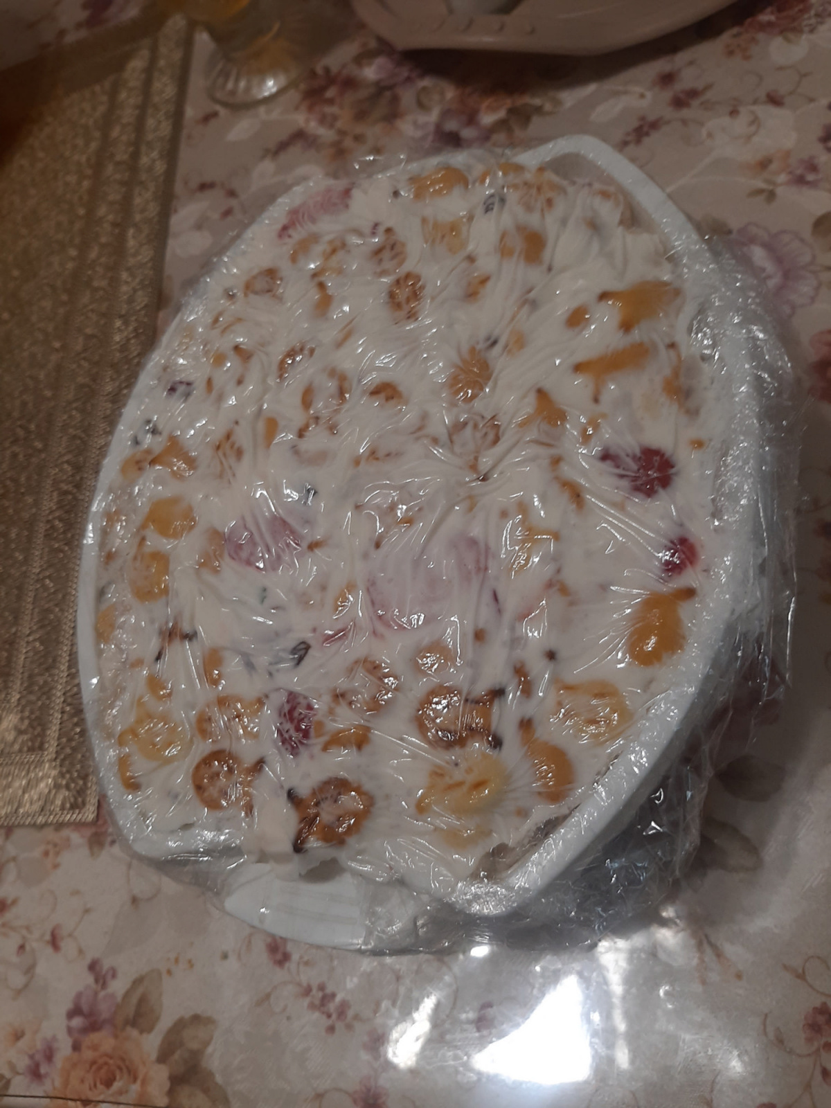 вытащить, потянув за хвосты пленки перевернуть на блюдо, должен получиться хорошо пропитанный и держащий форму конгломерат торта, украсить-как захотите