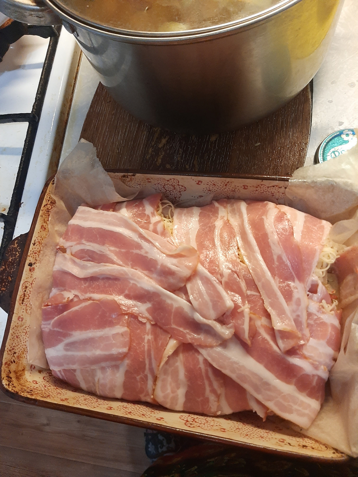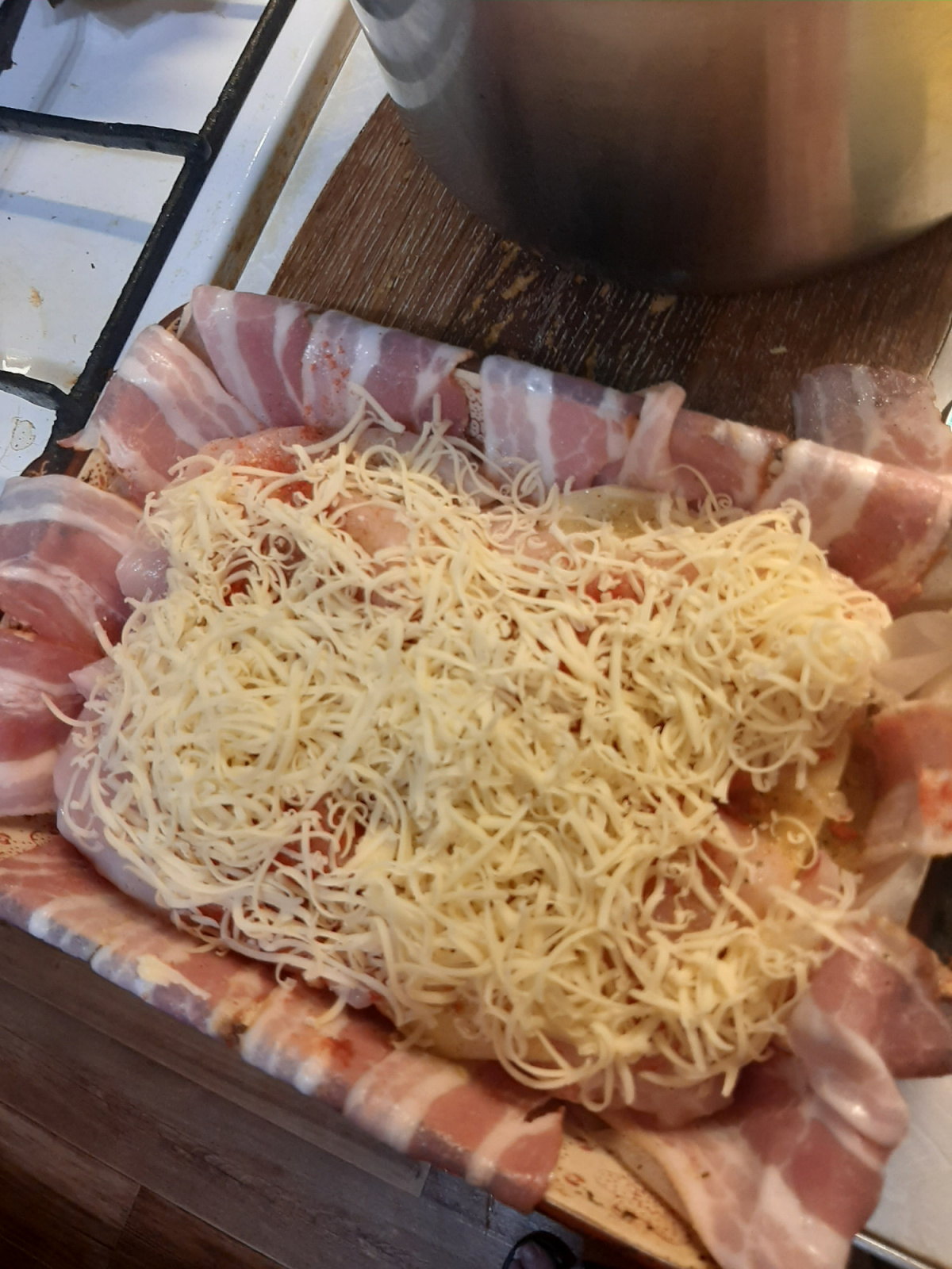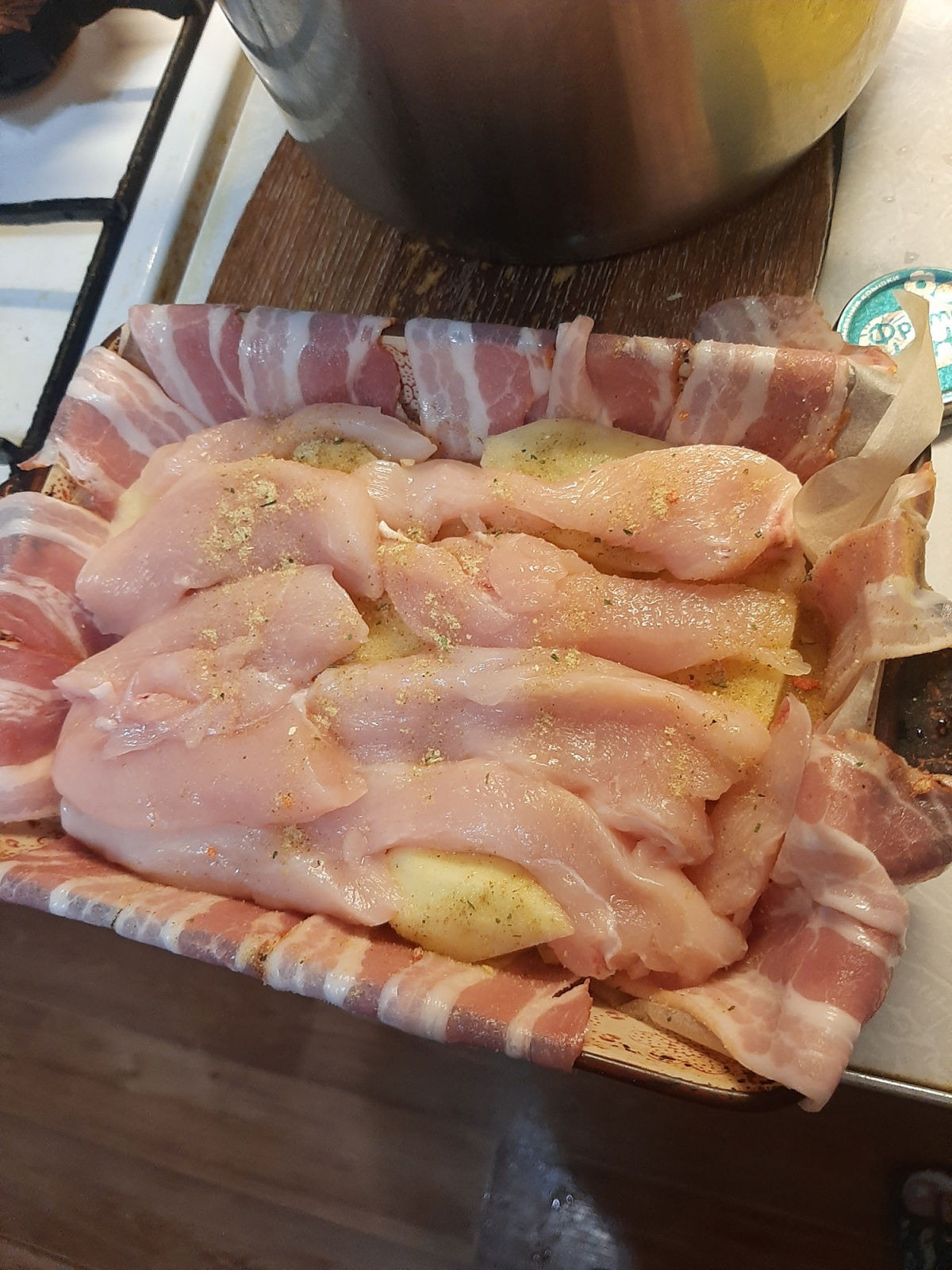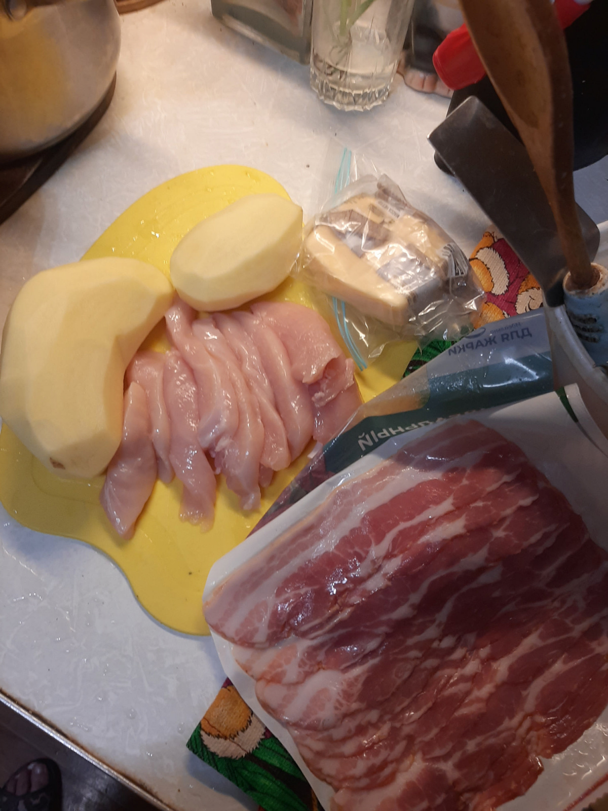 итак-картошка, бекон, куриная грудка, сыр, специи какие пользуете… все