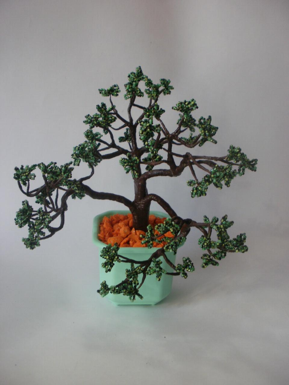 Когда я увидела деревья Алёны Башкатовой hipez, влюбилась с первого взгляда. Решила, что надо сделать такое обязательно. Разумеется, у меня, наверное, как у всех новичков, самомнение зашкаливало и я даже не сомневалась, что у меня получится ничуть не хуже. Изучив МК, в котором всё было понятно и просто, я ринулась искать бисер. В ближайшем окружении зелёного цвета не было совсем, единственный подходящий оттенок был меланжевый чёрно-зелёный. Нужно было наплести 200 веточек. С этим я справилась быстро. А когда стала собирать, мне их оказалось слишком много. Вот тут моя самоуверенность стала таять и дошло, что не всё так просто и легко. В итоге, я сделала два «экземпляра», потому как деревом это назвать можно с боольшой натяжкой. Одно было подарено подруге, а второе стоит у меня в назидание, чтобы вовремя сбить спесь, когда меня заносит в мечтах…